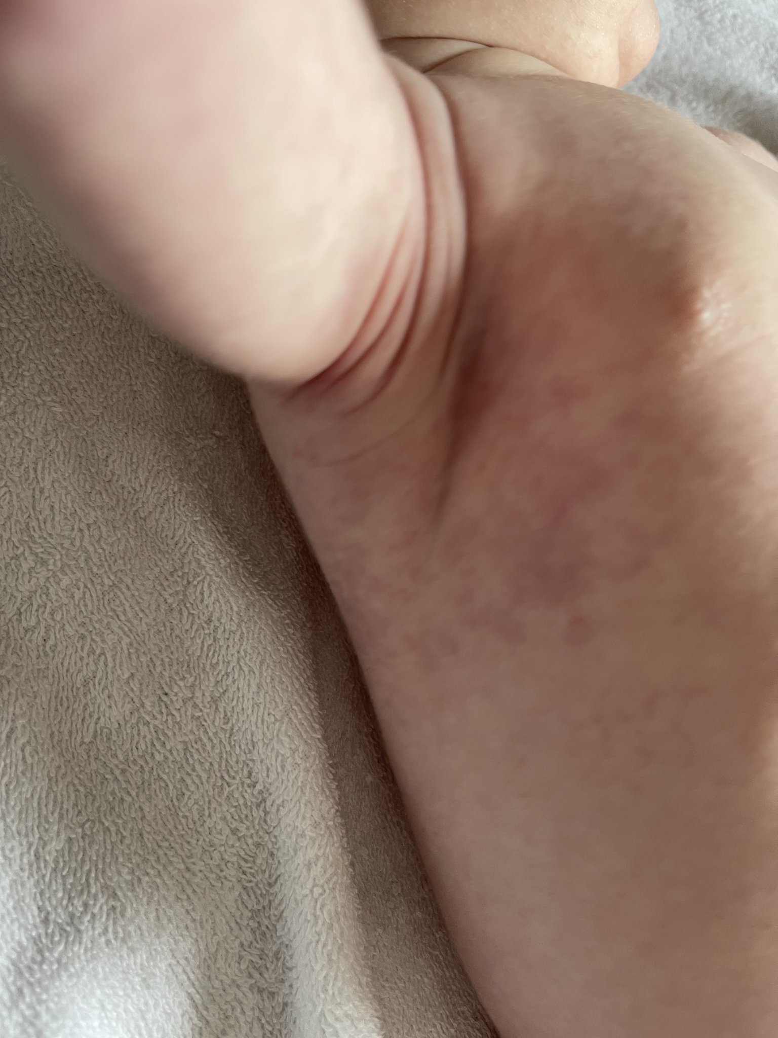 Имам бебе на месец и половина и още в родилния дом забелязах, че има червено петно под мишницата. Посъветвах се с педиатрите и един от тях ми каза, че е от претопляне и да не го пипам, друг, че е като подсечено и да го мажа със Судокрем като мажа и дупето след баня. Детето ми имаше други здравословни проблеми и не се бях сетила да попитам по-рано педиатъра, защото петното не изчезва. На последната консултация го показах, но то почти не се виждаше, а след баня винаги се зачервява. Избягвам да го мажа, за да не го влоша преди преглед при дерматолог. Козметиката, която ползва е: измивен гел на Биодерма, олио на Хип (с това бяха в болницата и реших да не го сменям) и кремовете за подсичане ги редувам - Судокрем, Македонска крема, Биодерма, Бепантен (последните два за подсечено дупе, тъй като имаше и леко зачервяване, което овладяхме навреме). Ще приложа снимка.
