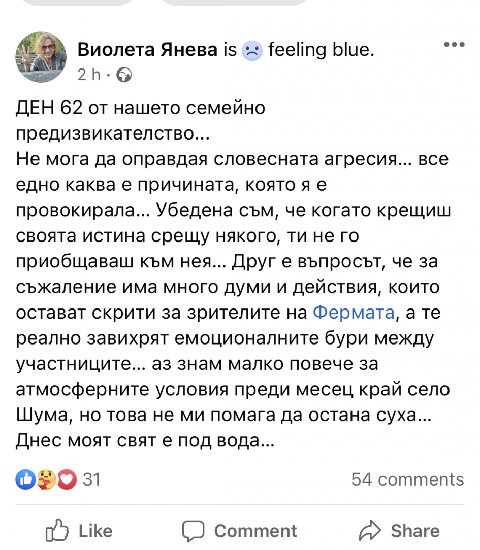 Много се изписа за Кирил и Ивайло, но каквото й да се каже ще е малко. Жената на Кирил се оправдава с монтажа… какъвто и да е монтажа, колкото и да се опитат да те злепоставят, не могат да те представят в коренно различна светлина от това, което си. Ескалира доста напрежението от зрителите след събитията с тези индивиди от последните епизоди. Аз не гледах епизода в понеделник, но се радвам, че съм си спестила толкова негативизъм и злоба. Иначе навсякъде в социалните мрежи хората негодуват от поведението на Киро и Ивайло срещу Ваня, под профилите им в Инстаграм, във фб, писма до СЕМ се пишат чак. Дано И и А си извадят поуките и вместо хора, които могат да покажат най-низкото от себе си, да избират по-смислени участници като Стефан.