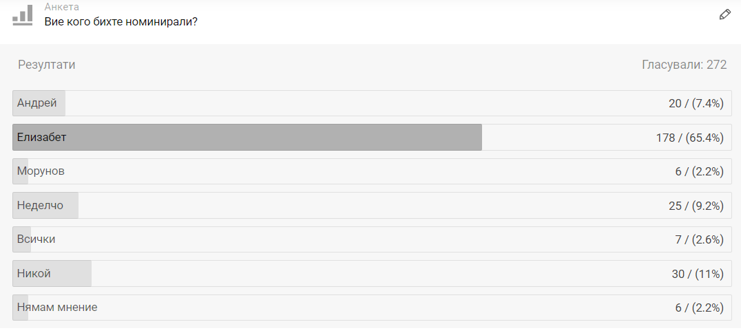 Много достоен съвет за бойците. Без хитреене, без тънки сметки, без предимства. И вчера, и днес. Без самозалъгване, без оправдания, а откровени за грешките си. Никаква злоба не видях. Вчера даваха анализите на сините за това как евентуално ще гласуват бойците на съвета - то не бяха едни сметки, едни изчисления, кой кого ще прецака и за какво ще си използва предимства, грошове, съюзи и т.н , а нищо от това не стана. Симпатични са ми всички. Неделчо - забавен, весел и откровен. Елизабет - призна грешките си, не тръгна да се оправдава. Да, и на мен ми беше в повече това за доброто и злото, но го отдавам на младостта и идеализма- всичко е черно или бяло, всичко или нищо, сега или никога. За Андрей и Морунов - какво и да кажа все ще е малко. И ми е тъжно, че така се случи, но причини много.