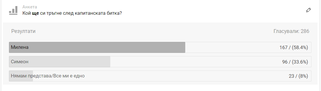 Който и да беше напуснал, щеше да ме е яд. Повече за Миленка бях като че ли. И двамата играха добре на баланса с топчето. Обаче Милена сама се би. Много нервност, много нещо. Аз също смятам, че в началото заби Симеон заради грешното "един". Направи ми впечатление обаче, как я похвали пред другите и каза, че за малко не го е била. Това ми хареса. Успех на Милена!!