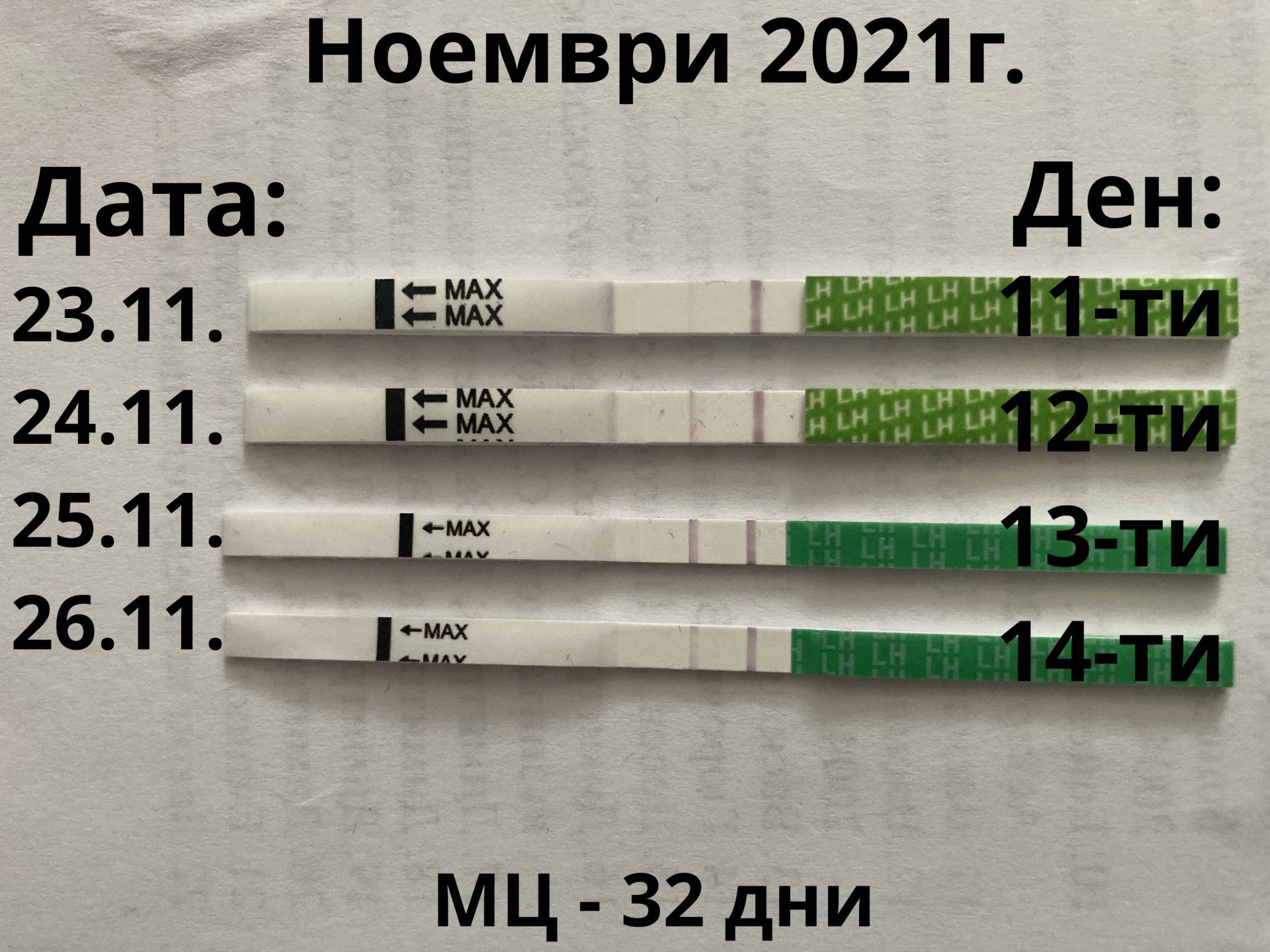Дарлинг, на фона на другите лентички мисля, че е достатъчно наситена, тя малко е и засъхнала вече днес. Пикът на хормона е 12-48 часа преди овулацията, с твоя цикъл с дължина 32 дни може и утре да се случи. Според мен действайте и днес, и утре, не губите нищо.