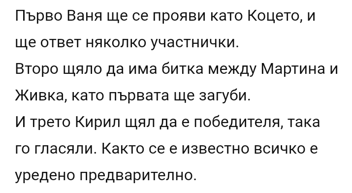 Дам, някой е ошамарил Ивайло, нямам търпение да разбера кой и да си сипя една ракия за негово здраве, нищо, че не пия Joy  Ами за Киро уж го гласяли за победител, ама това е само слух, предположение. Момичето, което ми написа този спойлер, ако иска може да даде повече разяснения откъде ги знае тези неща Simple Smile