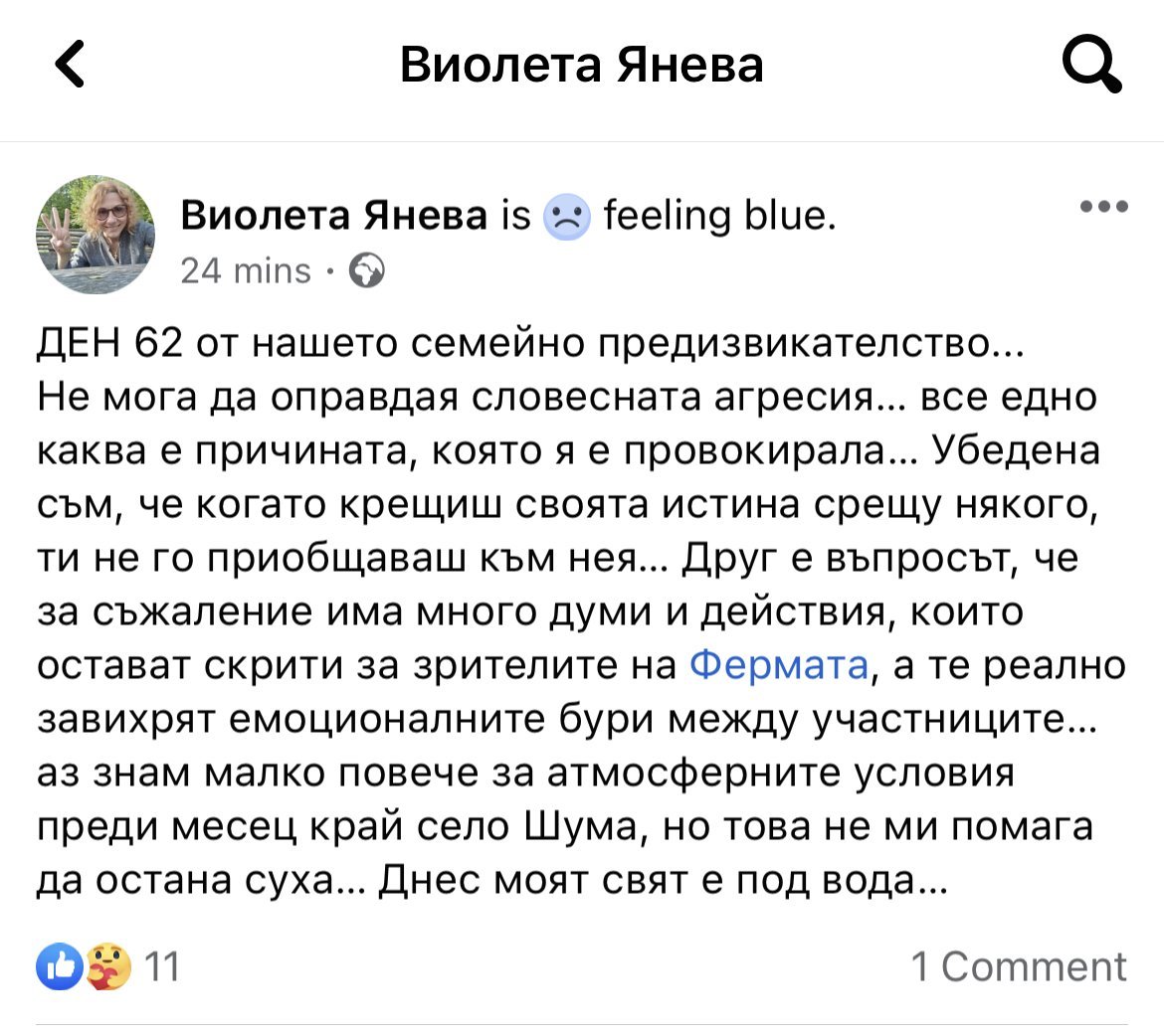 Значи стана ми много болно за Ваня, аз и в другата тема го писах, но най-мъчно ми е за Виолета. Винаги съм се чудила, как една будна, умна жена, с богат речник, мъдра и емоционално интелигентна, и т.н ще си избере мъж като Кирил?? С лупа да го търсиш!