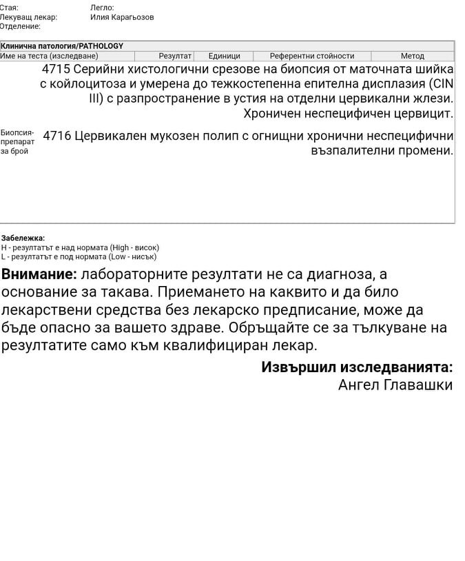 Здравейте. И на мен ми взеха биопсия в Петък,и още не е излязла. Докато цъкам да проверявам дали е излязла пулса ми се дига до 120 ,толкова се страхувам от резултата. 2 лекари един от който въпросната Цветанка Ралчева уж работеща от 40г в онкото с колпосколоп ми казаха раничка и никакви мозайки около канала,успокой ме ,сега Карагьозов мозайка около канала  че даже как видя без цитонамазка и биопсия че е високостепенна,като намазката от Ралчева в  Геника беше 3а нискостепенна и видя само малка раничка,е на кого да вярвам?! Като излязох от кабинета нещо измъмри на сестрата доктора, което ми се стори съмнително,че нещо скри от мен. Нали бил идеален,казвал всичко. Иначе много мил,говореше ми сякаш съм му дъщеря- "детето ми" .Объркана съм. От кого да поискам трето мнение ,препоръчайте някого, на когото имате 100 процента доверие. Моя близка ми препоръча Иван Иванов онколог от Варна само с такива неща се занимава човека. Бил много точен, момичетата от Варна просто да си знаят. https://superdoc.bg/lekar/ilian-ivanov Има часове за Януари. Също за Русе пак е в околието доктор Кунев има свой МЦ за ин витро,спаси моя позната на 29г е сега преди 4г  и е нямала проблеми от начален стадии на рак, даже забременя благодарение на същия лекар и има момиченце на 2 годинки. Просто не винаги всичко е в София. https://www.facebook.com/medicinsckicentyrdrKunev/