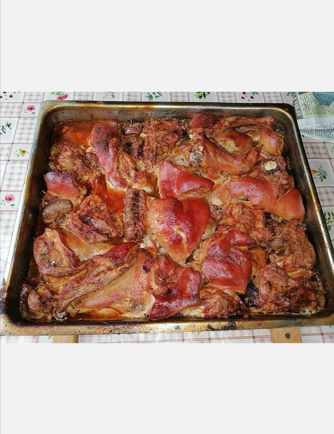 Любимо печено от малко прасенце. Елементарно за приготвяне, а така любимо на цялото семейство. Месото го нарязвам на порции, след което го намазвам със смес от сол, черен пипер, червен пипер и мас. Така приготвено го оставям на студено и на Коледа само го изпичам под фолио.