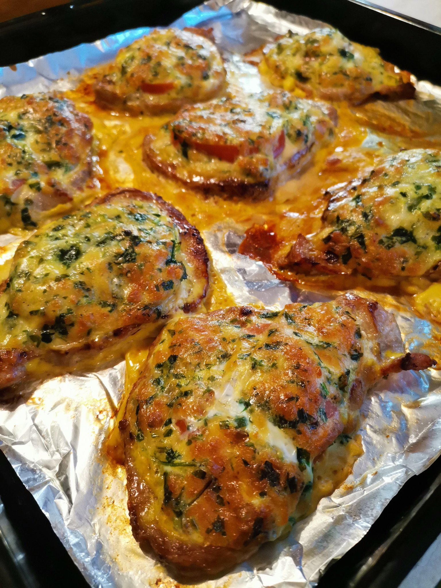 3. В тава нареждаме пържолите, отгоре нареждаме резени домат и плънка.