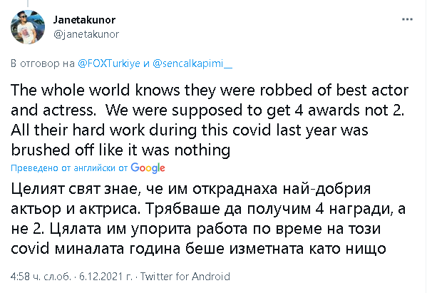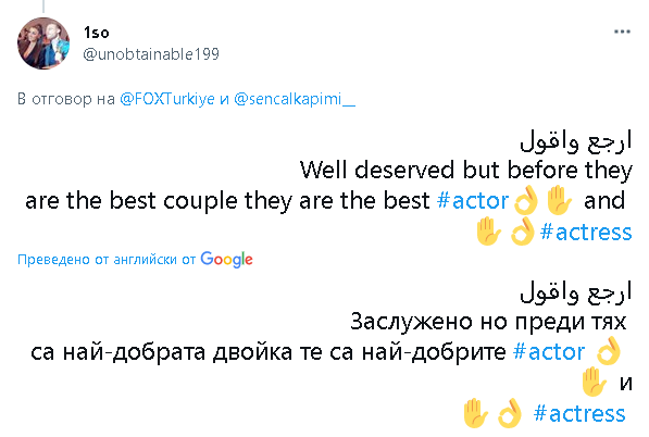 Има ли по-добра двойка от Ханде и Керем, а вие безсрамно дадохте наградата за актьор и актриса на други? Има ли някой, който блести повече в романтичната комедия от Ханде и Керем? Тези, които дават тези награди, нямат ли представа за понятието справедливост?