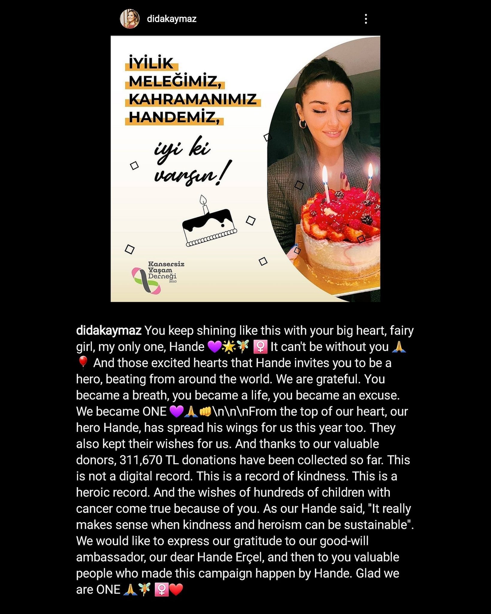Нашата героиня Ханде, чието сърце е по-голямо от нейния ръст, разпери криле за нас и тази година. Те също изпълниха своите желания за нас. И благодарение на вас, наши уважаеми дарители, досега са събрани 311 670 TL дарения. Това не е цифров запис. Това е добър запис.