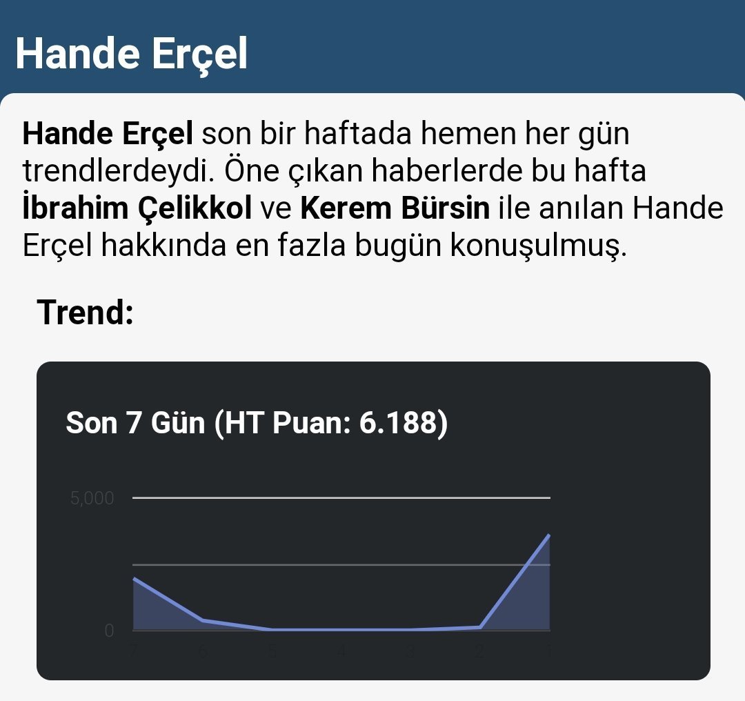 Според Haber Trend новините за #HandeErçel влизат в списъка с тенденции почти всеки ден тази седмица. Вчера той беше 13-и по популярни тенденции в Турция и беше публикуван в 29 вестника. Той също така следва висока диаграма в почасовите тенденции Символ за замайване