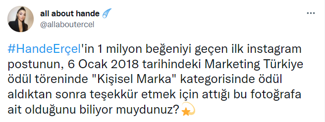 Знаете ли, че първата публикация в Instagram на Ханде Ерчел , която надхвърли 1 милион харесвания, принадлежи на тази снимка, която тя публикува, за да благодари, след като получи награда в категорията „Лична марка“ на церемонията по награждаването на Marketing Turkey на 6 януари , 2018 г.?