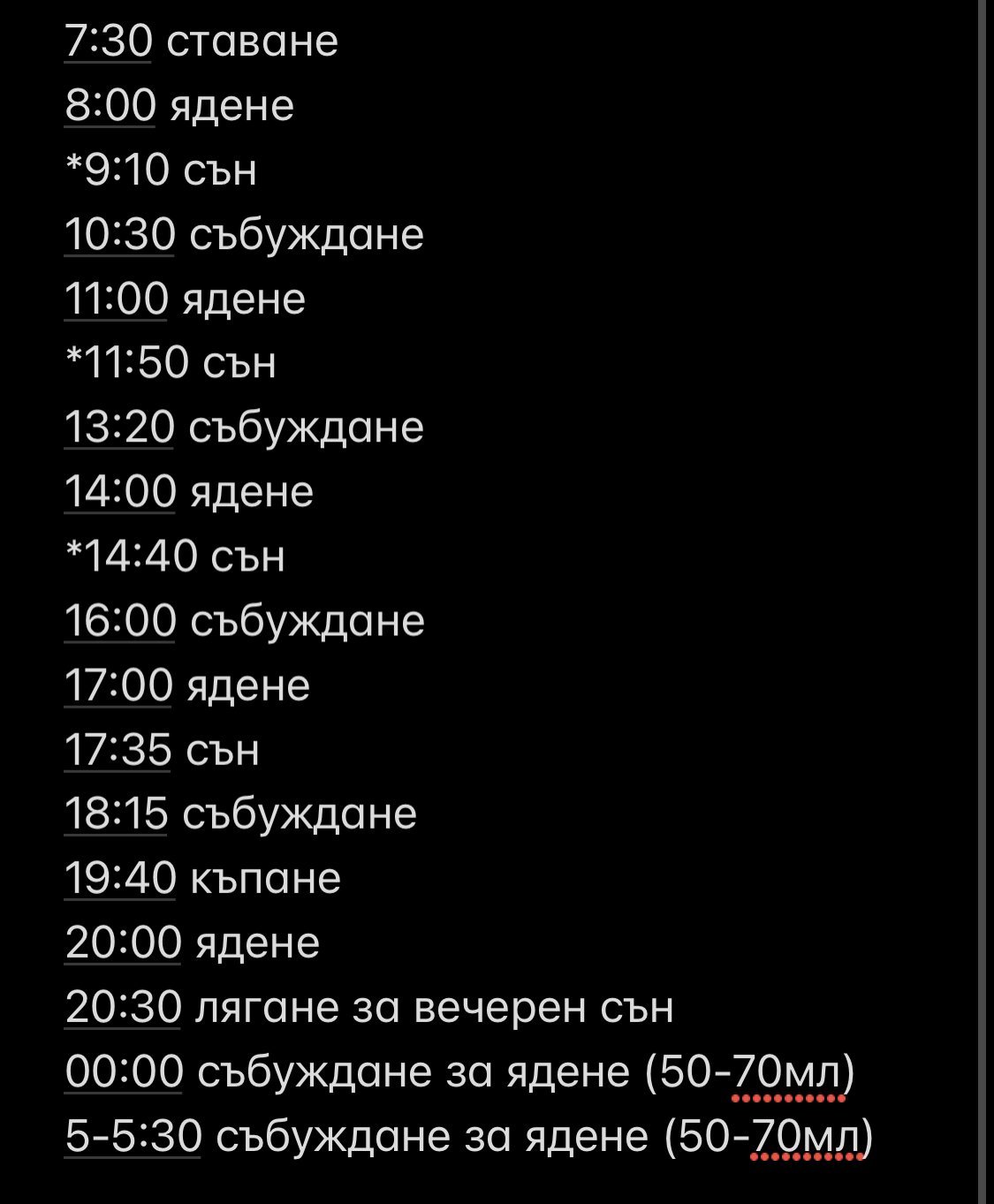 Към 8 сутринта заспива за около час. Към 12 ч спи отново за 30-40 минути и към 16:30 за 30 минути. Часовете на заспиване през деня са много условни. Променя ги, а също и продължителността на дрямката.