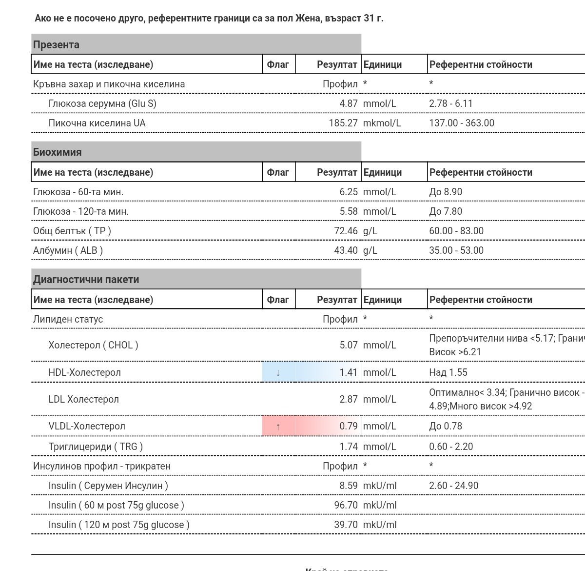Здравейте, от една моя любима тема(Искам бебе) ми препоръчаха да се запиша тук, защото можете да ми дадете насоки. 😊 Имам едно неуспешно инвитро, като съм пролактином, ПКЯ, висок 4-андростендион, след стимулацията и с високо TSH, висок холестерол още когато бях с поднормено тегло(-10кг). Винаги съм била много слаба, а сега съм с нормално тегло-59кг., 160см. от около 7 години. Според HOMA  нямам ИР, но ми се струва висок инсулина ми. Преди на гладно беше 13, а сега е 9 😊 Близо 5 месеца пих Глюкофаж ХR 500мг. Прикачвам и резултатите. Имам преглед в София чак след 2 седмици, а в интернет не намерих референтни стойности и ще се радвам на коментар. За съжаление НВ-ВМХ при мен е неприложим. Много се притеснявам да не е всичко от аденома и да настояват да се оперирам. Направо съм си с цял метаболитен синдром, но с нормално тегло. Извинявам се, че стана доста дълго.