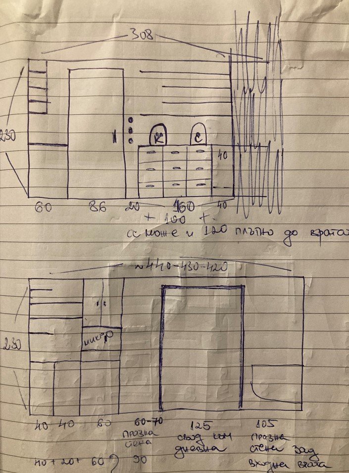 Сама проектирам моята кухня и бих се радвала да се допитам до чуждо мнение. Предварително се извинявам за нескопосаните чертежи на ръка (ако знаете безплатна програмка за 2Д проектиране - препоръчайте ми, за да ги направя малко по-професионално).