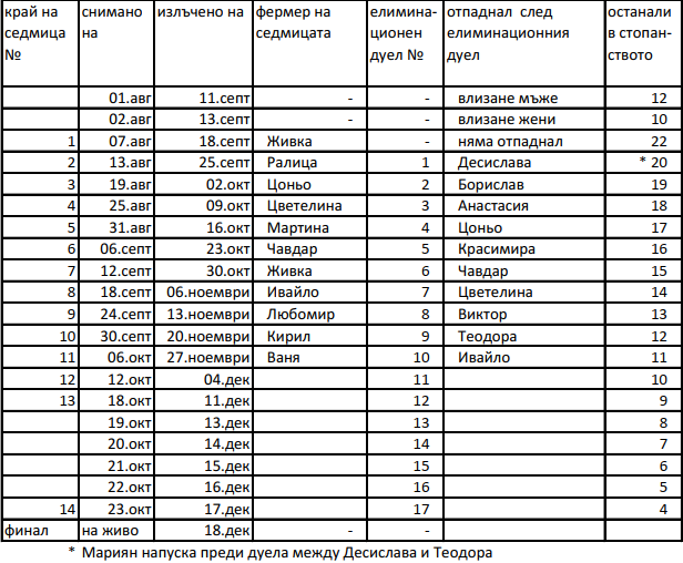 Място | Име | Дуелисти | Финални дуели | Имунитет за дуелист | Имунитет от ратайство | Алманах | Дуели за територия | Фермер на седмицата | Общо |