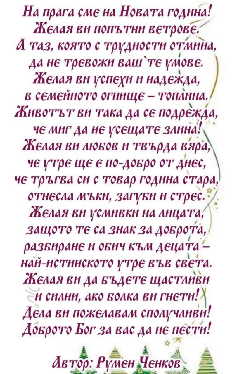 И аз искам да пожелая на всички да изпратите една хубава и да посрещнете една още по-хубава година!