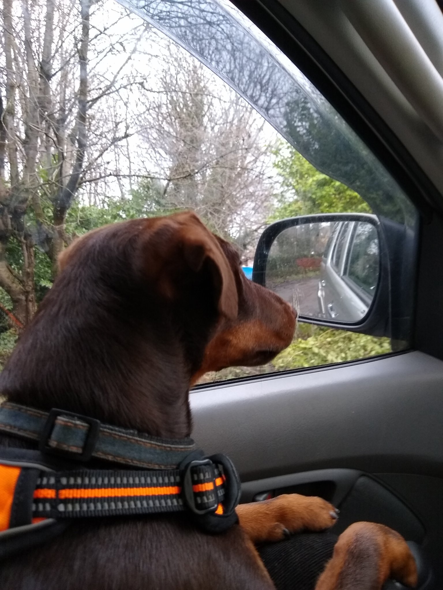 Шоколада уж трябва да си е достигнал максималния размер.... ще видим Laughing Обича да се вози, защото винаги се стига до любимо място - я до ветеринар /там го черпят здраво/, я до канала с патките на разходка LaughingLaughingLaughing