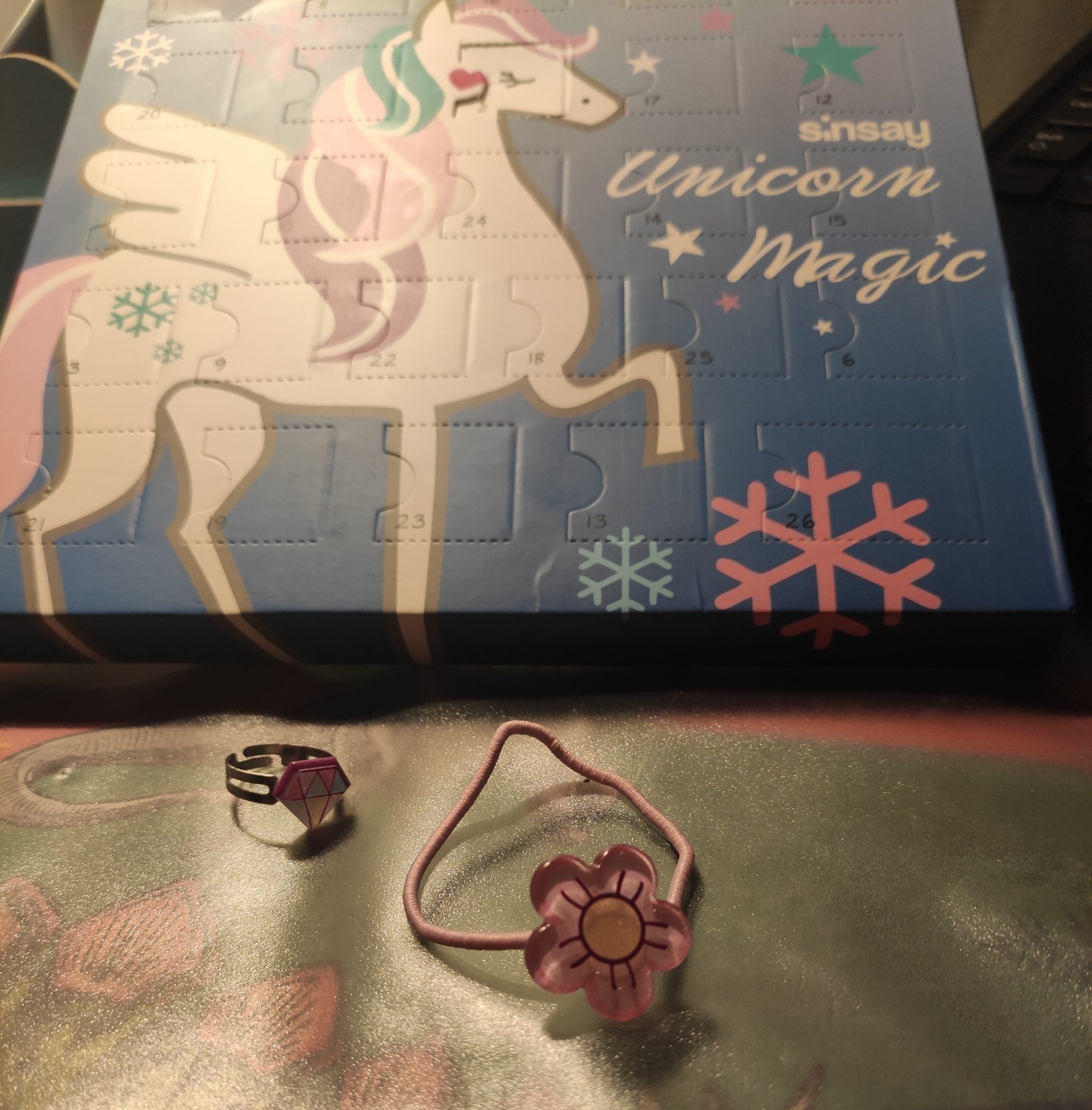 ) , комплект от 2 клина и естествено адвент календара с еднорога. Нямам забележки нито към материите,нито към размерите или качеството. Ето и първите 2 джунджурийки от календара - пръстен ,който се регулира и ластиче с цветенце ( което НЕ е лепнато със силикон ,а промушено) .т.е. изглеждат качествено нещата( което ме изненада дори) , а и малката много им се кефи.