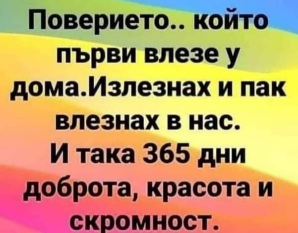 Сега пък аз се връщам от фирмено парти и какво?... Дълги разбори, защо толкова късно и защо яката ми мирише на парфюм, после точилка по главата и "Върви на майната си, пиян добитък", и "С теб не разговарям"...
