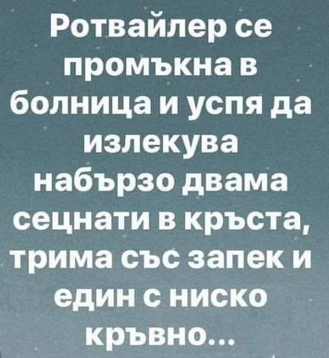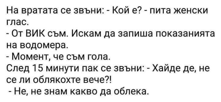 Отивам вкъщи. Жена ми ме гледа на каранттина. Турила маска и два шала под нея за по-сигурно. А аз си ходя нормално. То ако имаше нещо, досега да се е разболяла. Хич не им вярвам на тези, - обясних и аз. Обаче тя ме изолира в спалнята. Постоях малко и и предложих да се разменим – тя да отиде в спалнята, а аз в хола. Щото така ми отрязва пътя до хладилника и терасата. А там са чушките, ракията и сланината. Разглеле, склони. Как да е изкарахме вечерта. Два пъти слизах да душа зелето – същата работа. На другия ден тичам да видя резултата – положителен. Край! Време е да се сбогувам с близките си. Прибирам се обратно. Звъня на личния лекар. Той ми двигна на двайсе и третия път и вика – какво си се развънял, да не умираш? А, не бееее! Викам, изписвай веднага някакви лекарства, че съм с модерния вирус. А оня ми разправя да съм си купел витамини от А до Я плюс още няколко с немската азбука, да пия аспирин и по 5-6 литра вода на ден. Ай, това с витамините ще го преживея. Ама вода не съм пил от 2015-та. Викам, не може ли тая вода да я сменим с нещо. Бира примерно. Доктора казва – слушай какво ти говоря, ако искаш да те излекувам. Не разбрах как ще ме лекува, като той си е в тях, а аз у дома, но приех съдбата си. Дейба и водата....Викам на жената – тая вода няма вкус. Тя ми казва – идиот, водата по принцип няма вкус. Ох....поне водата усещам значи. Точно легнах и си пуснах беларуското първенство и звъни телефона. От РЗИ ме търсят. Егати кефа. Много важен станах откак влезнах в статистиката. Господин Петров,- казва жената, считано от днес до трийсти декември няма да излизате от вас. Няма да контактувате с други хора, освен семйеството. Вие сте под карантина!