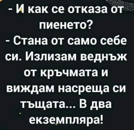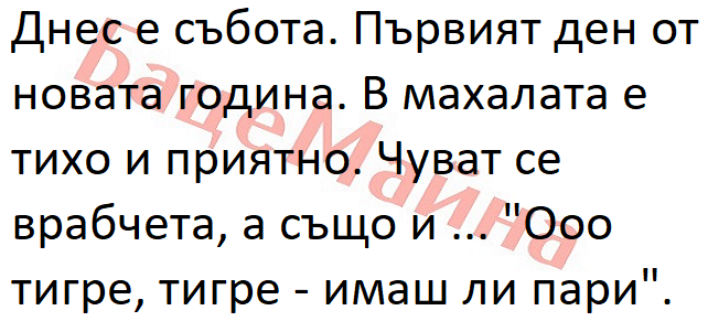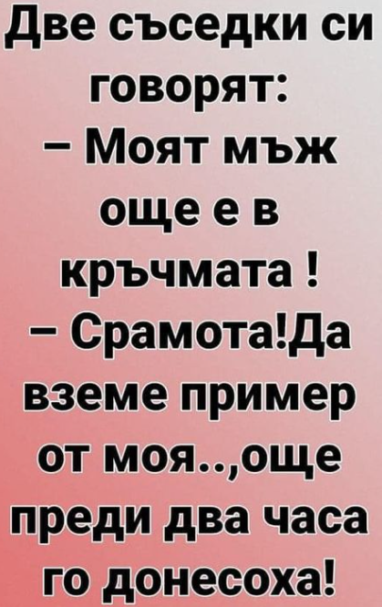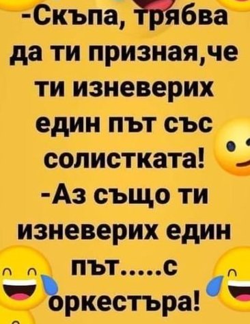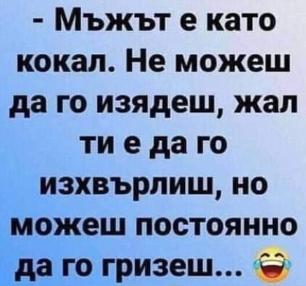 Кацам на летището в София след дълга командировка. Не мога да включа телефона. Батерията е паднала. Мога да го заредя в барчето, но най-евтината поръчка е 3 лева. Няма да им дам 3 лева на тези обирджии, си помислих и хайде на такси за вкъщи. Прибирам се, отключвам, от спалнята идват някакви звуци. Открехвам вратата тихичко и...жена ми и някакъв мъж се работят така, че ще счупят леглото. Тихо затварям вратата, излизам от вкъщи, вземам такси и се връщам на летището. Поръчвам си вода за 3 лева и си зареждам телефона. Обаждам се на жената, че съм кацнал и се прибирам с такси. У нас жена ми ме посреща радостна и гальовна. Всичко е чисто и подредено. На масата ме чакат сочни пържоли, бутилка от любимата ми ракия, салати и мезета. Хапвам, целувам се с жена си, попийвам и си мисля "За някакви си 3 лева каква жена щях да изгубя!"
