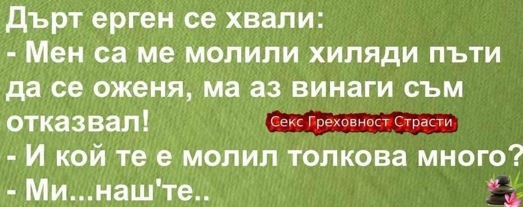 - Понякога случва ли се да сте на различни мнения с жена ти? - Да и то много често! - И тя как реагира? - Никак, тя даже и не подозира...