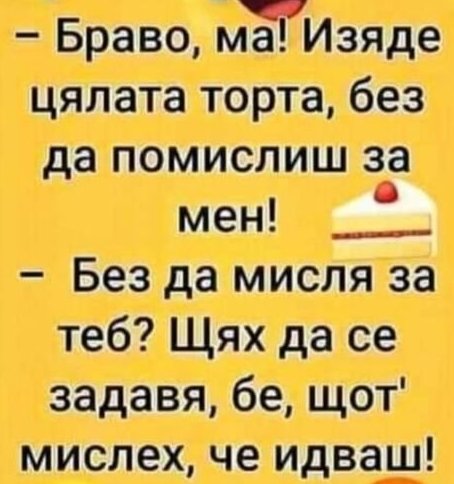 - Марче, снощи в хладилника имаше 4 парчета торта, а сега е само 1?