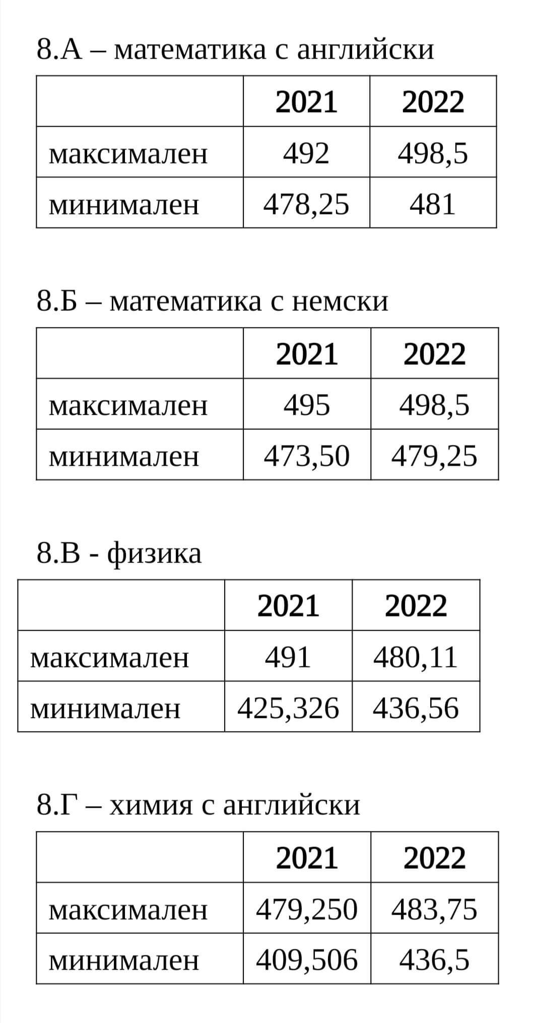 На 12 юли излезе първото класиране на приема след VII клас. От 2018 година до днес максималните и минимални балове за прием в НПМГ устойчиво се качват. Предлагаме на Вашето внимание статистиката само за последните две години, защото тогава, за да приемем първите си петокласници, се отказахме от едната паралелка „Природни науки“ и от паралелката „Софтуерни и хардуерни науки“, променихме балообразуването в 8.Г, 8.Е и 8.Ж клас.