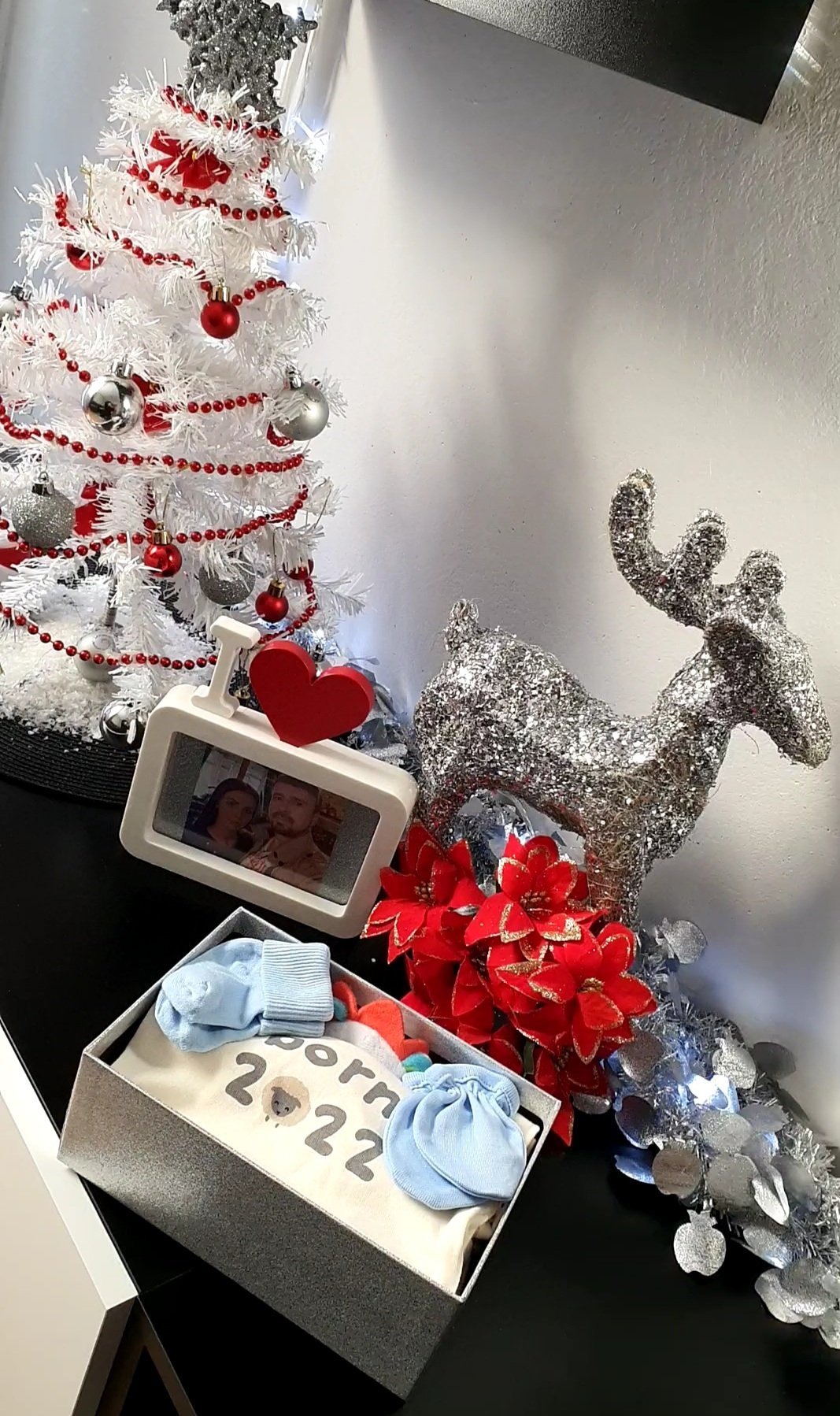 Честита Коледа, момичета! Бъдете здрави, щастливи и Благословени! Нека 2022г. ви донесе чудото за което мечтаете! 🙏🎁☃️ Тази година нашият най-скъп подарък изглеждаше така!.. Не се усмелих да разкрия в мрежата, все си мисля, че е рано, затова само загатнах с надпис и затворена кутия, а на вас в и презентирам с отворена 😁Чудех се, дали да вземам нещо, но все пак 2021 ми донесе най- голямото щасрлие и е редно да има под елхата и за бебо нещо! Весели празници!