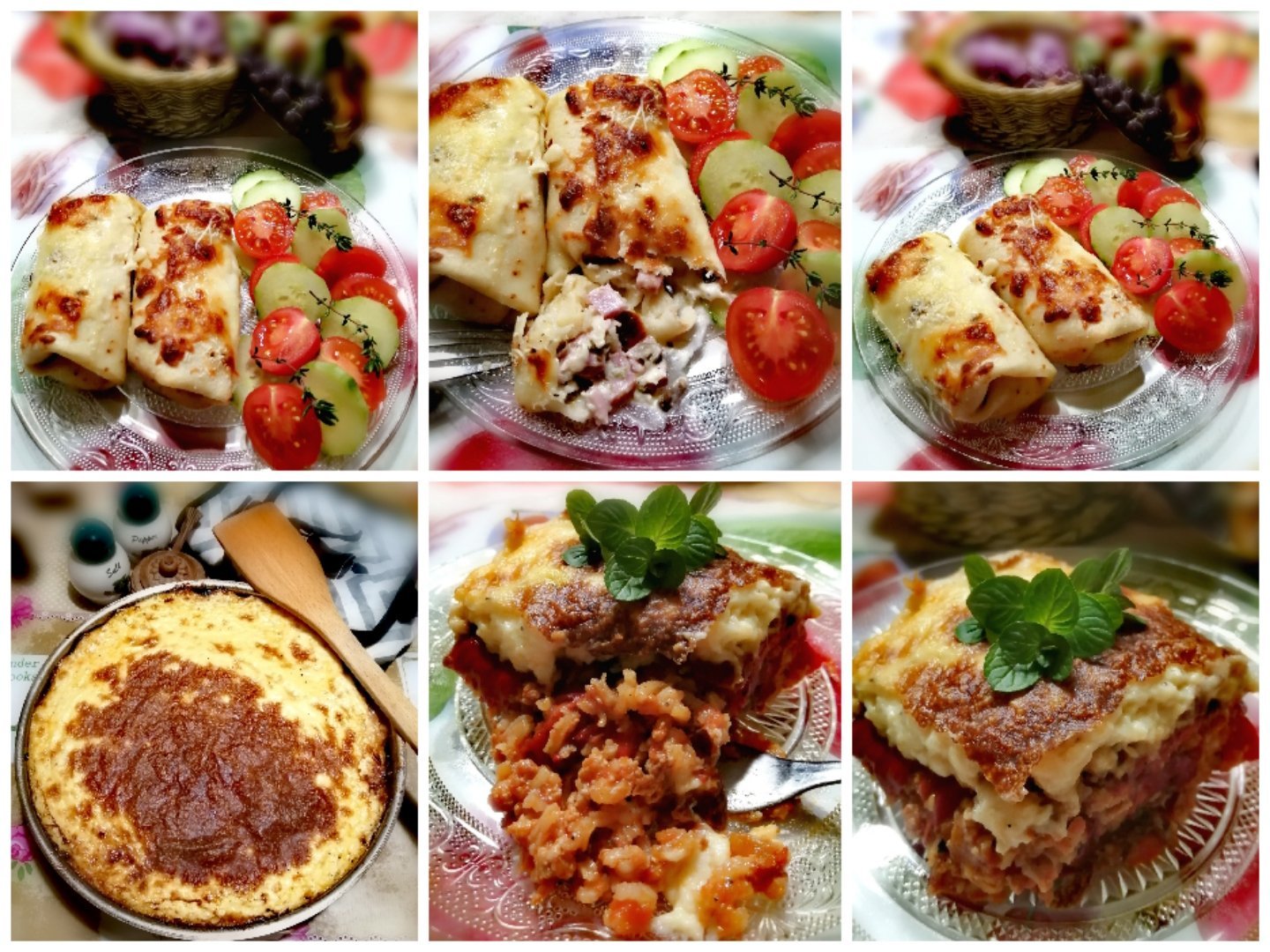 Палачинкови руладини със солена плънка и Мусака с печени червени чушки, мляно месо, ориз и бешамелова заливка: