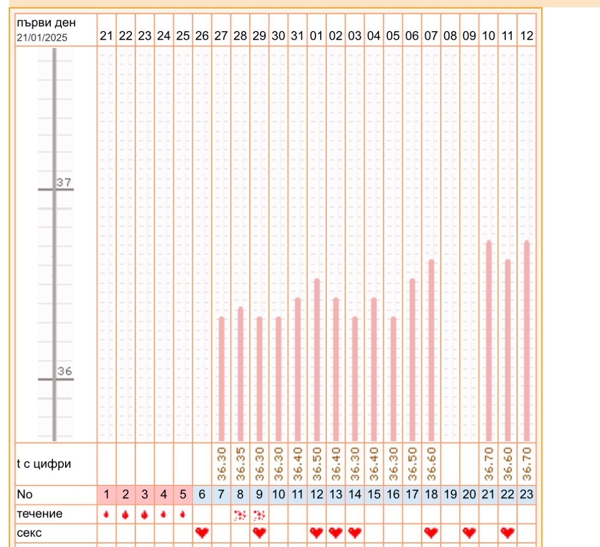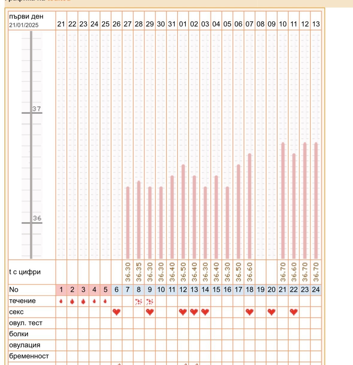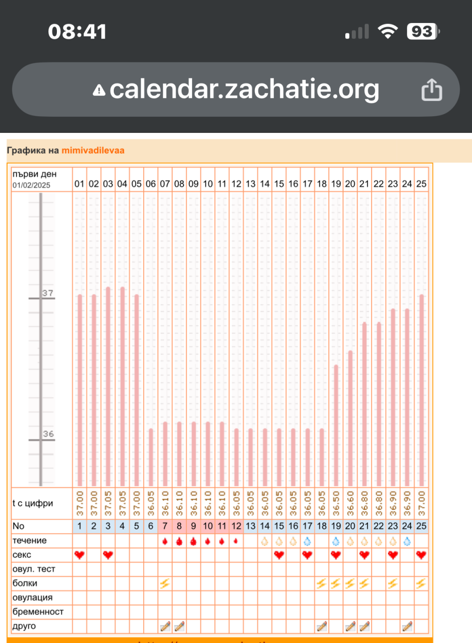 Може ли мнение относно графиката на БТ? Трети месец я меря вече, стойностите са все около 37°. На 30 януари ми е поставена trigger shot, съответно овулацията е на 31.01.25. Имах 2 доминантни фоликула при преглед на 28.01 с размери по 15мм /по 1 фоликул в яйчник/. Следим се в клиника, може да се наложи инвитро (тъй като времето лети), но разбира се преди това пробваме всички други познати методи. Благодаря!
