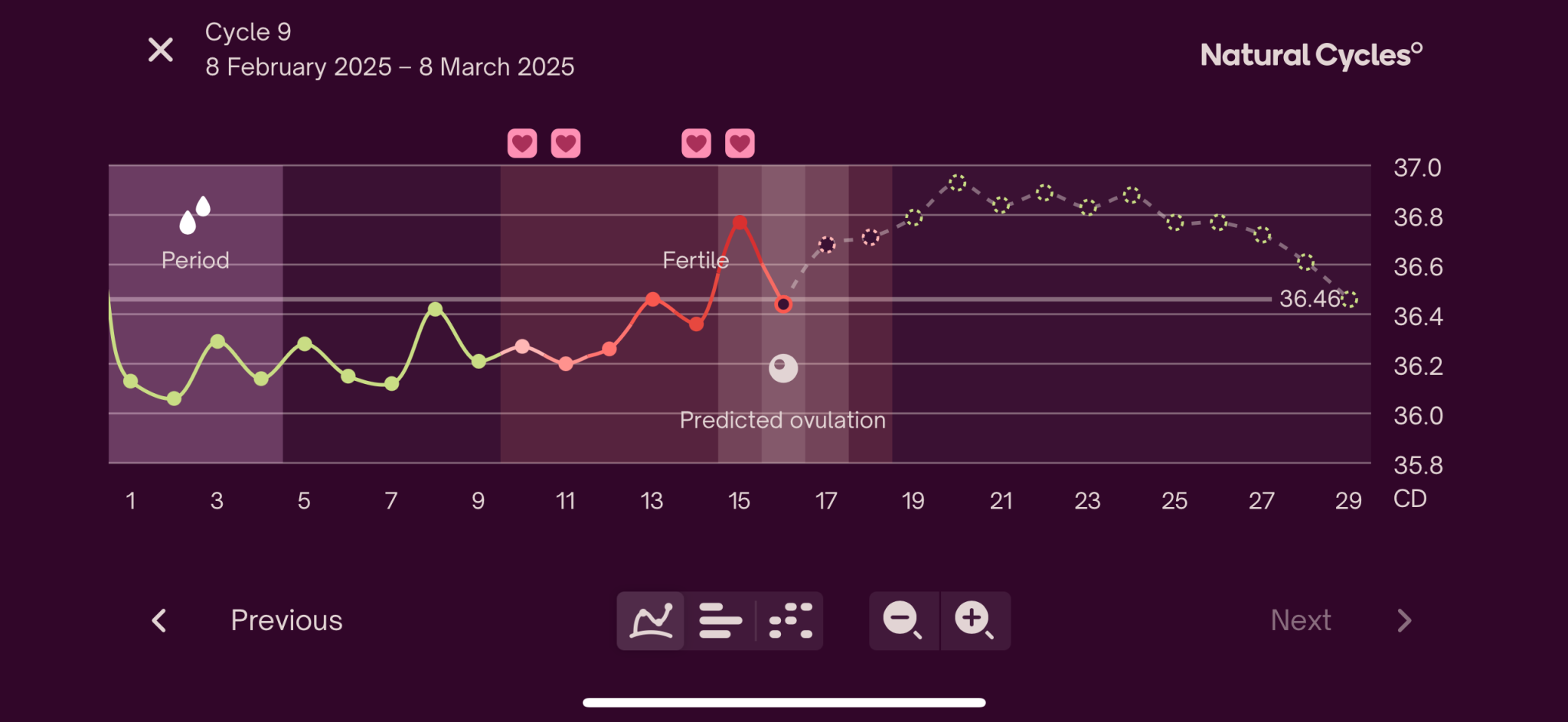 Здравей денис , имаш ли идея защо приложението показва че овулацията предстои все още, според графиката не е ли логично да е била на 14 ден точно преди повишаването на температурата, което е на 15 ден?