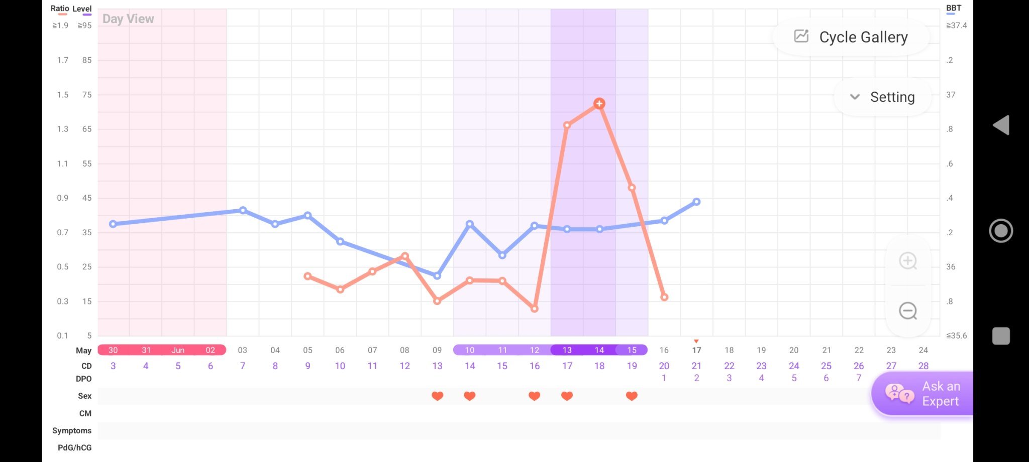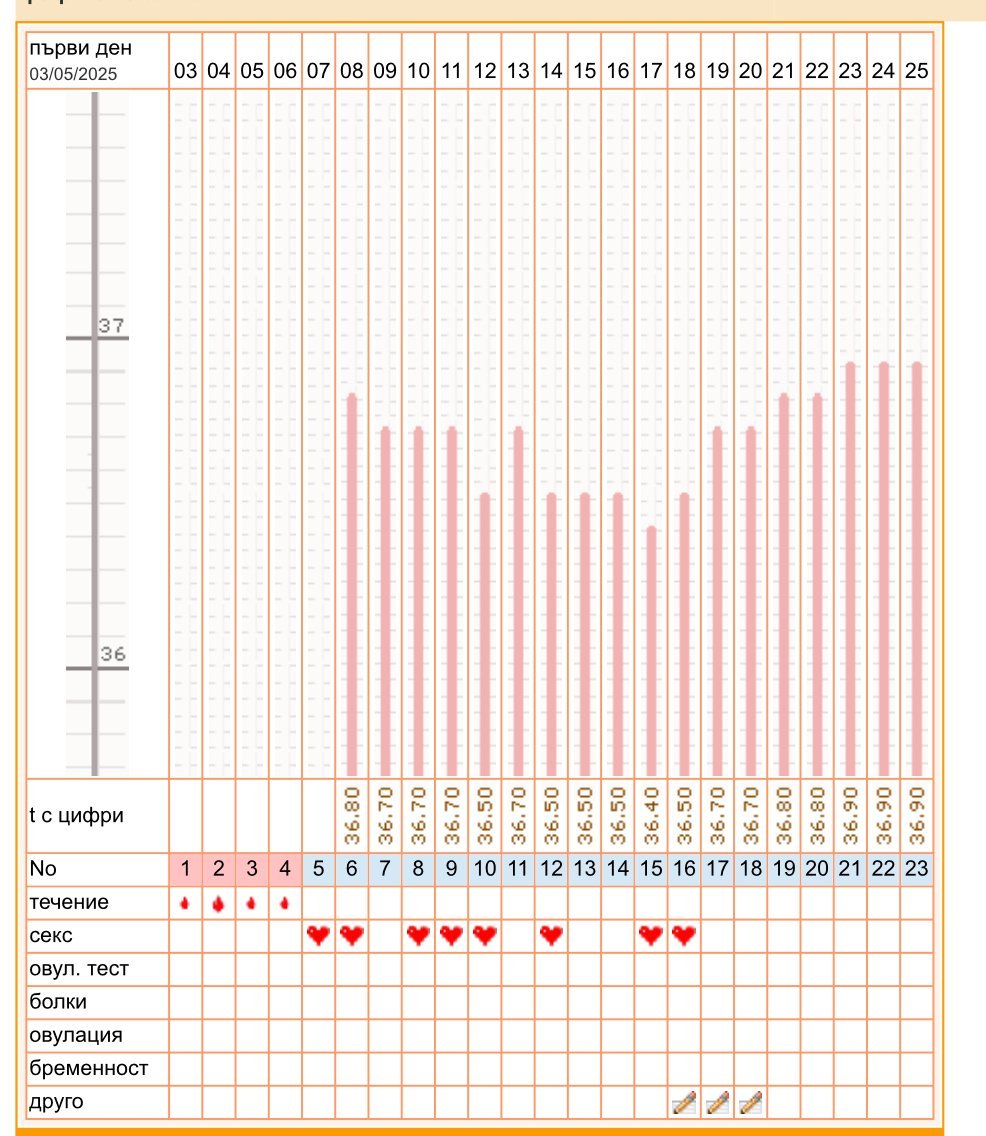 Здравейте! Денис, моля за мнение за моята графика. Според тестовете и температурата овулацията е била на 2