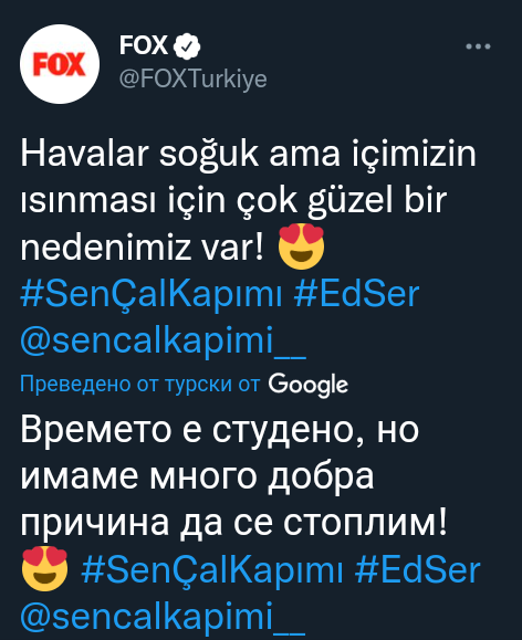Не знам до колко мога да бъда безпристрастна в класация за двойки, в която присъстват Ханде и Керем. Затова надали ще се изненадате, че най-много харесвам Еда и Серкан. На второ място се колебая между Йигит & Сибел и Керем & Зейнеп. Третото е за Дерин и Али, колкото и да не харесвам Лейла Лидия Туутлу. Химията между Йойкю и Керем нещо хич не се получи, не знам защо. И двамата за мен са много добри актьори, може би проектът не беше подходящ или не са се сработили достатъчно, не знам. Но с Ясемин и с Бурджу определено искам да го гледам отново. Даже с Бурджу ги виждам в Съдбата като Джемал и Асие. Баш ще им паснат тези роли. Евала на Акън и Йойкю, че са приели този проект.