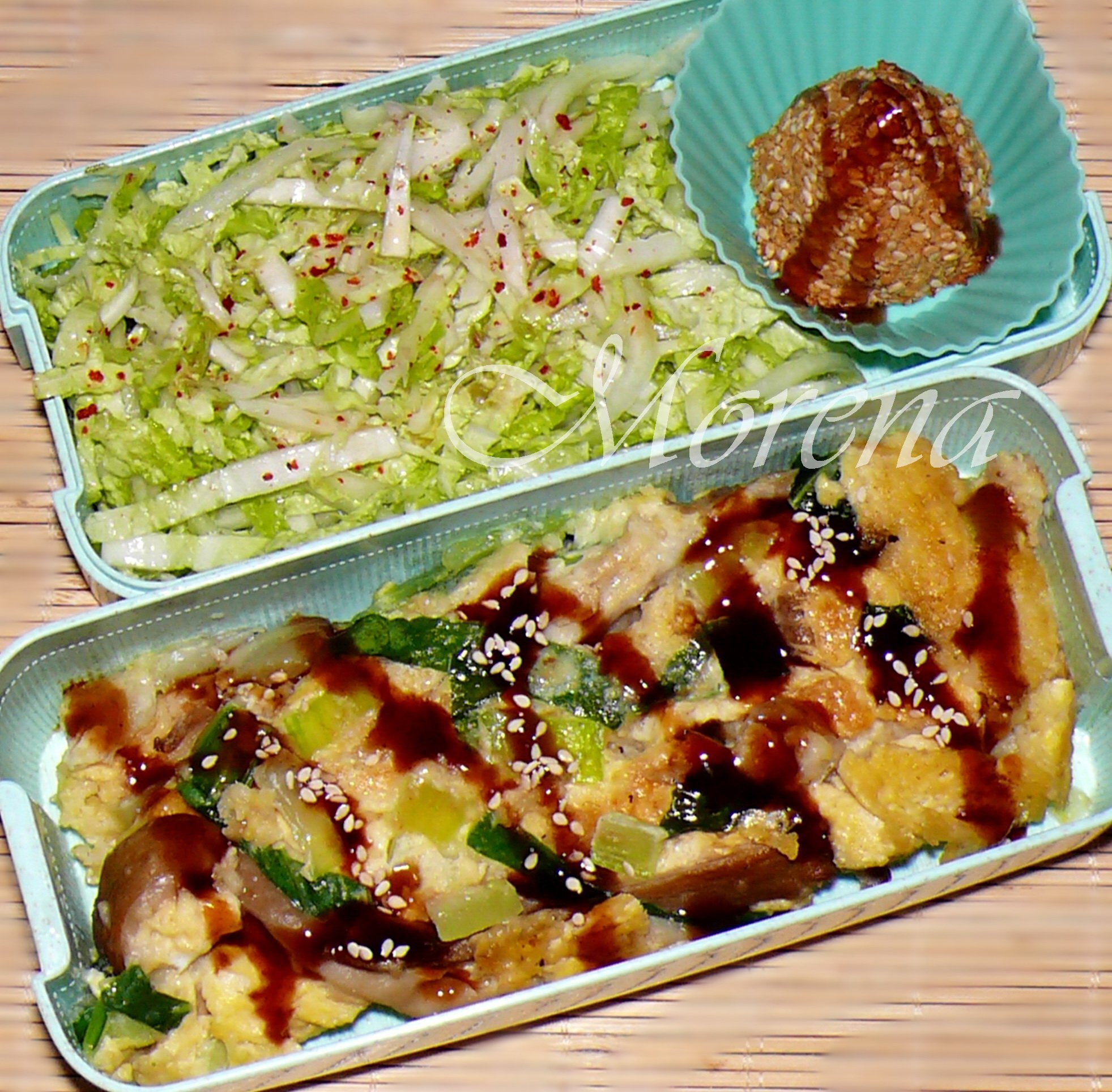 Обяд - китайска палачинка с яйца, Кладница и Бок чой; салата - китайско зеле с чили, оризов оцет и сусамово олио; домашна кокосо-сусамка с кашу