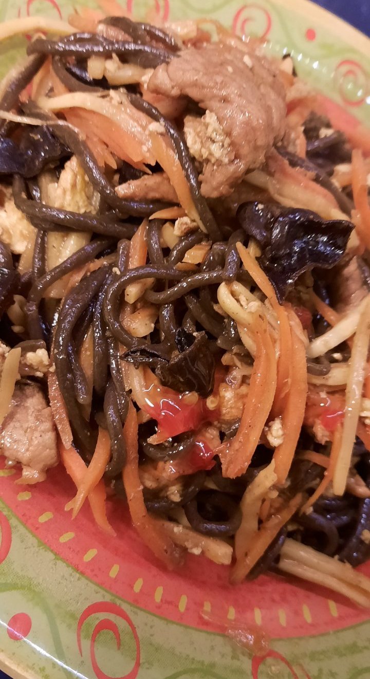 спагети с черен ориз, дървесни гъби свинско с 5 аромата , зеленчуци,яйца