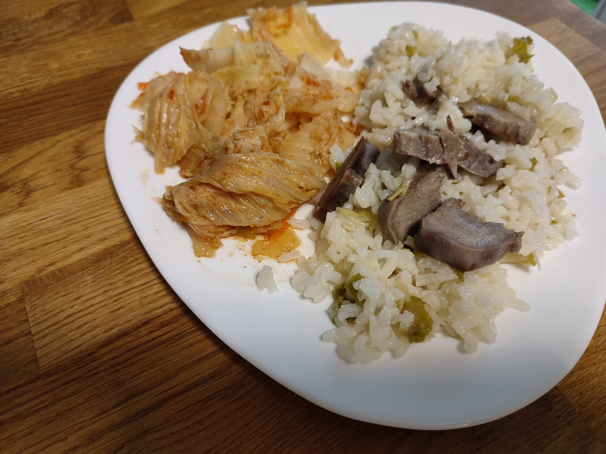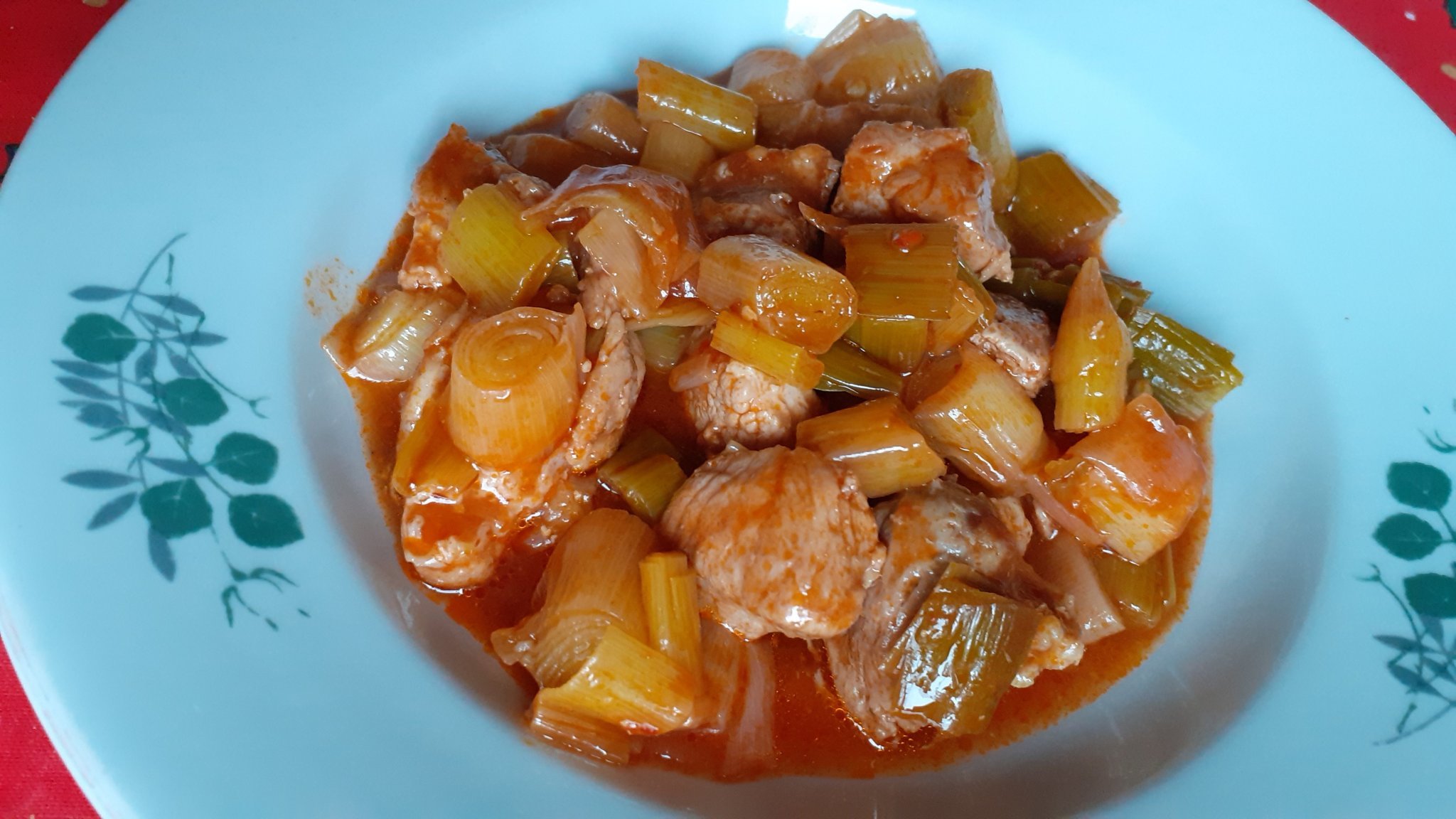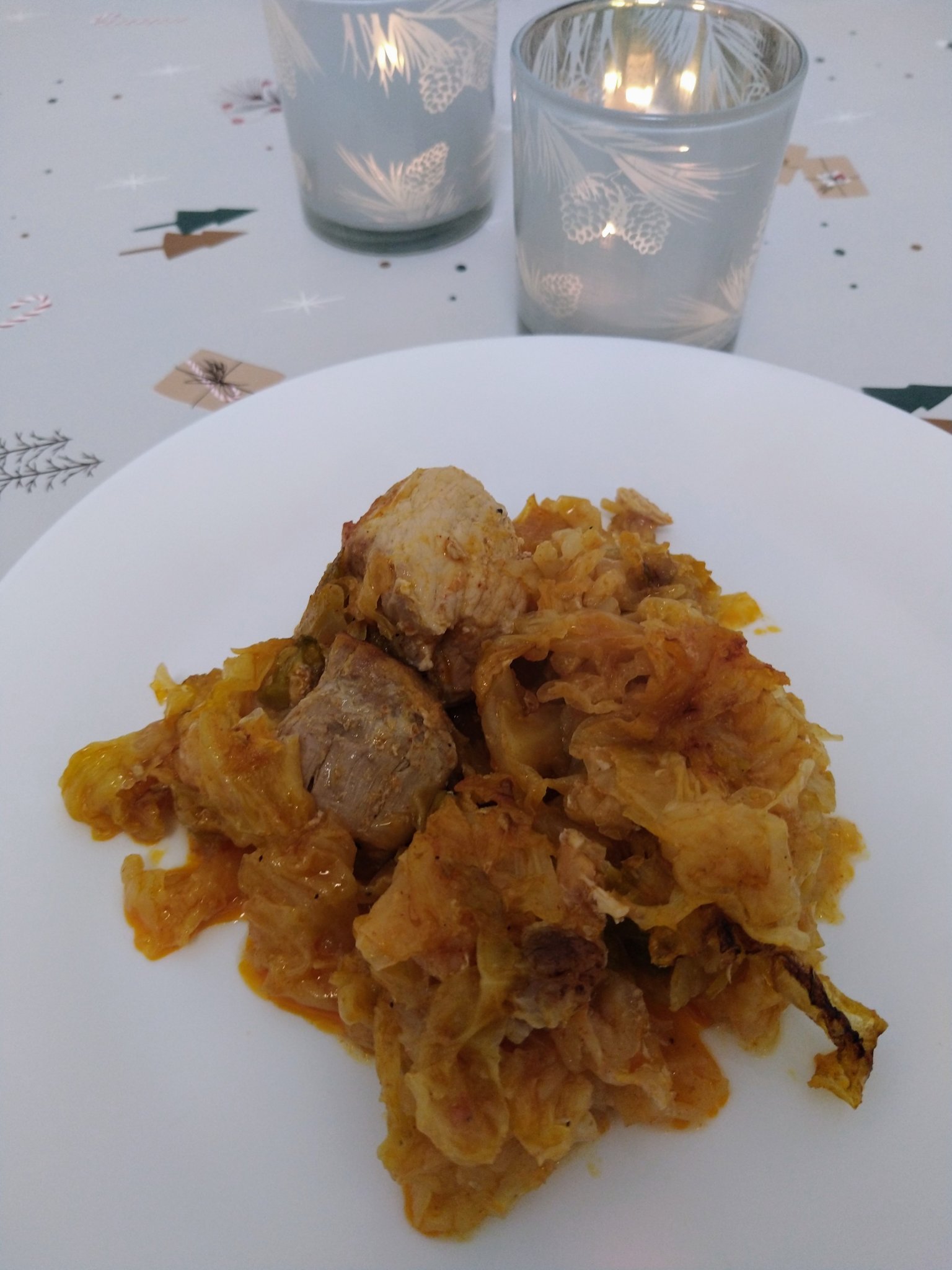 Ние сме на домашно свинско месце с кисело зеле / казвам го, защото през последната година почти отказахме яденето на свинско, не ми беше вкусно това от магазините/.