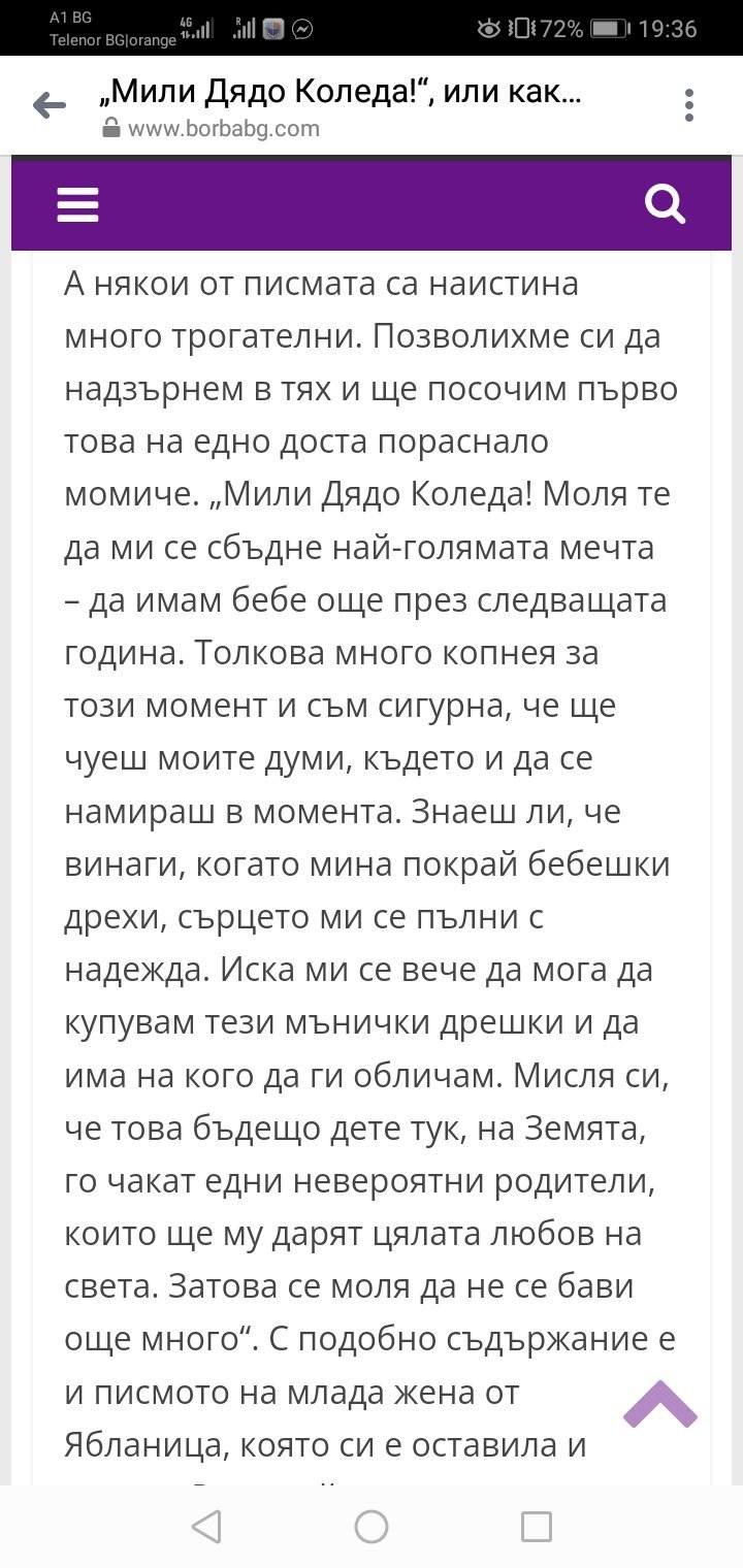 Момичета, искам да ви оправя малкото лошото настроение и да ви кажа какво се случи - преди около 2 седмици направих нещо, което не съм правила от 5 годишна - написах писмо до Дядо Коледа, като вътре писах, че си мечтая за дете и всякакви такива неща. Преди малко бях в кухнята и ММ ме извика, за да ми покаже, че от един търновки онлайн вестник са видели моето писмо и са написали част от него в статията си 😳