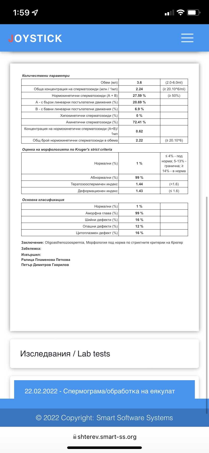 И така. Ще бъде дълго. Хроничен простатит от 13 години. Пазили сме се до април 2021, тъй като мъжът ми имаше натрапчиви мисли, че ще ми предаде я някои коки, я ешерихия ( който се е сблъсквал с този бич простатит с калцификати знае за какво говоря). Април 2021 пуснахме първата ни спермограма - беше плачевна 3 млн концентрация на млн/мл, обща бройка 7.3 млн, морфология към 1 %,  20% прогресивно подвижни, множество левкоцити. Тогава ни казаха, че и ин витрото може да не проработи.
