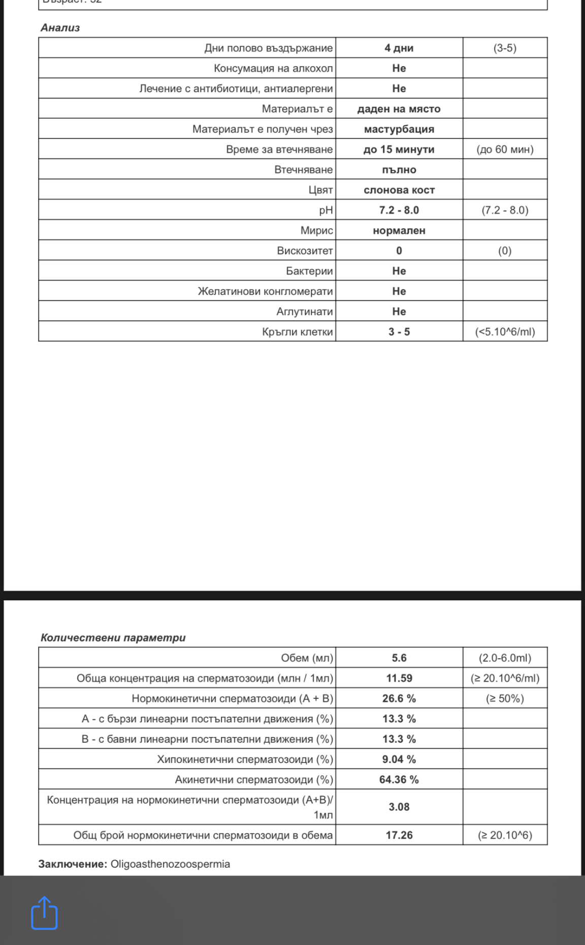 Здравейте, мили дами, аз съм на 28 години, имам високи тсх и пролактин, за които приемам лекарства, с приятеля ми, който е на 35, правим опити за бебе от 8 месеца без успех. Направи си спермограма и днес излезна, прикачвам я тук. Има ли някакъв шанс за подобрение и нормално зачеване? Тепърва ще започваме ходенето по лекари. Ще съм благодарна, ако някой може да ми даде съвет или сподели опит!