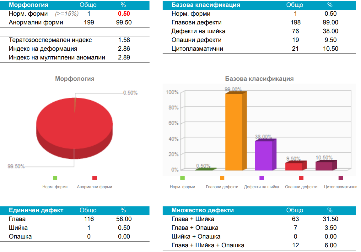 Задължително направете втора спермограма в друга репродуктивна клиника. От една е прибързано да се правят изводи. Също трябва да прегледат съпруга ви за вариокоцеле и бих ви препоръчала да си направи андрофлор, да се види за бактерии. Трябва да опитате да откриете причината за тази лоша морфология.