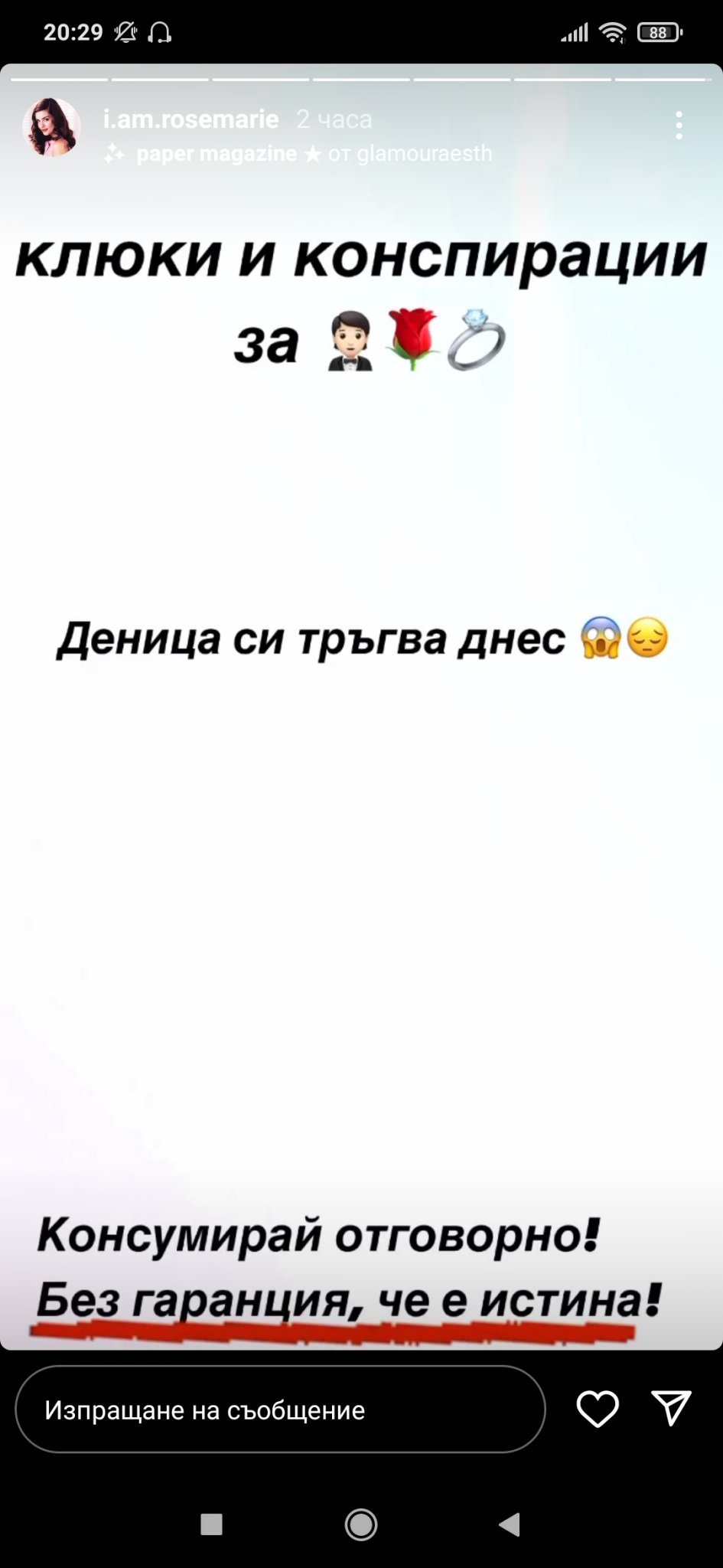 Хич не ми се иска да напусне Алекс. Нали даваха, че имат среща, изглеждаха щастливи. Защо ще си тръгва чак сега, а не в последния епизод. Физиономията й била, като че ли ще откаже розата, ама може да е като монтаж и заблуждение.