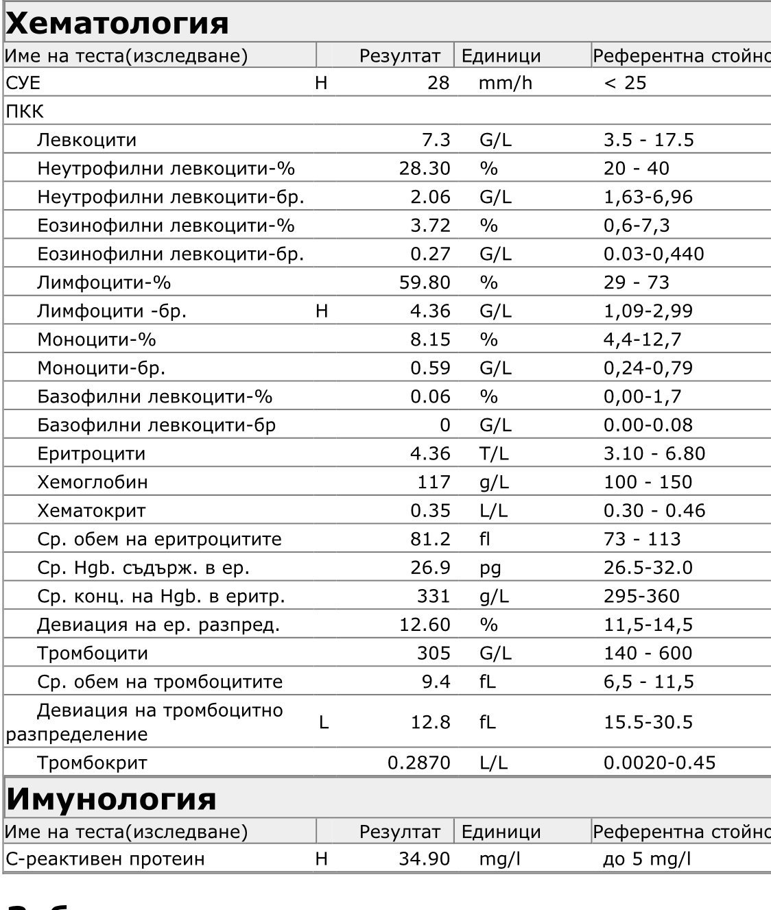 Здравейте, много съм притеснена какво точно показват тези резултати. Бебето е на 1.3 г.днес я водихме при педиатъра ѝ, защото от снощи вдига и сваля температура - сутринта имаше 38.7. Назначи ѝ кръвни изследвания и съответно резултатите излязоха чак сега и тъй като е петък вечер педиатърката не ми отговаря. Тя назначи антибиотик Панцеф, на база високото црп, което излезе по-рано днес, ако има някой по-запознат подходящо ли е да започваме този антибиотик Thinking