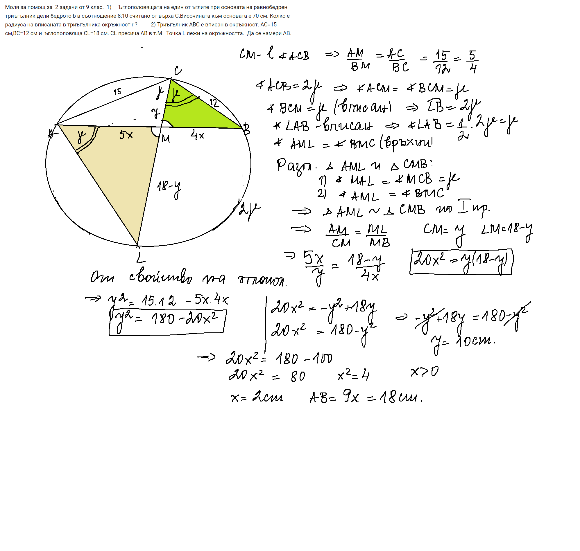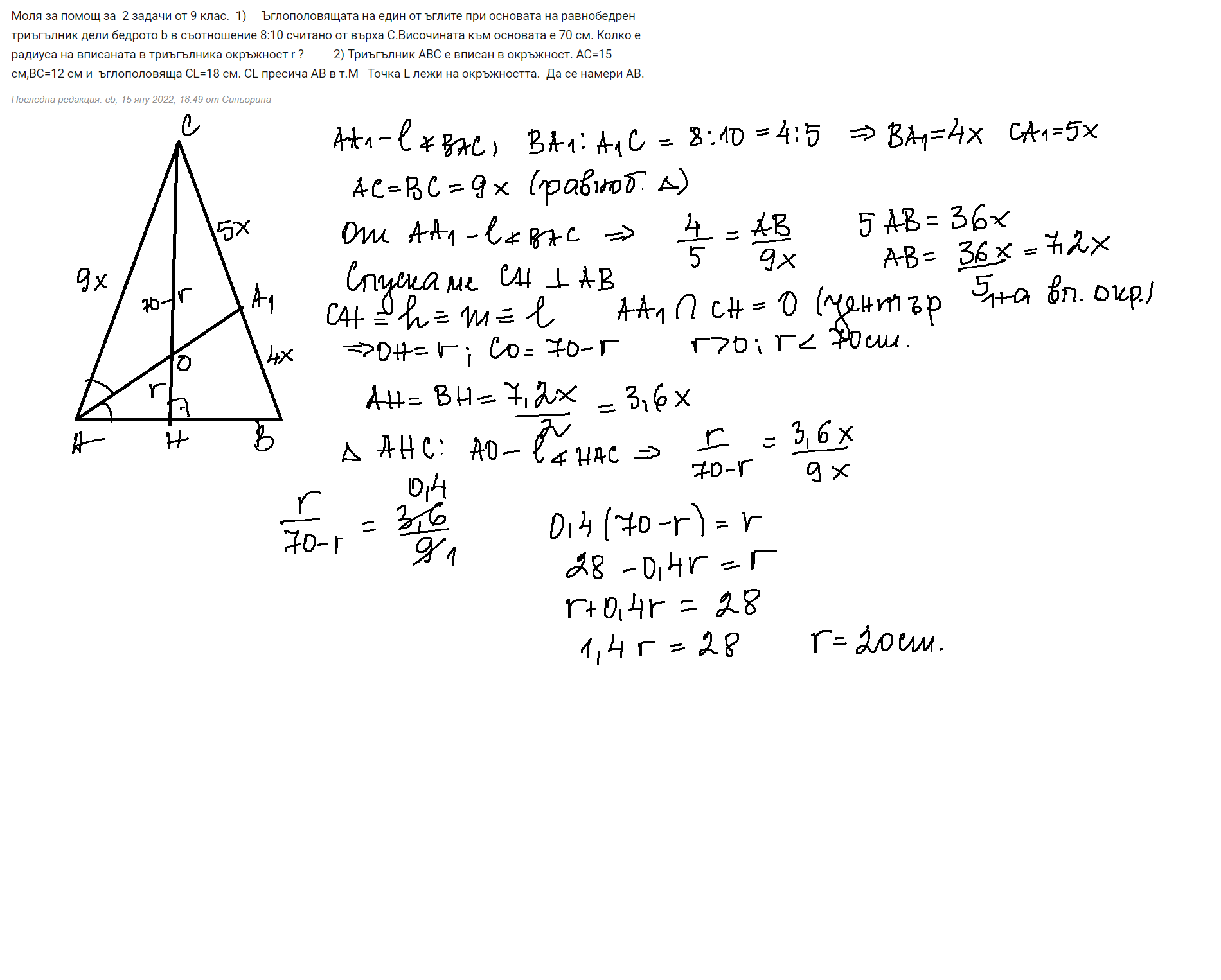 Моля за помощ за  2 задачи от 9 клас.  1)     Ъглополовящата на един от ъглите при основата на равнобедрен триъгълник дели бедрото b в съотношение 8:10 считано от върха С.Височината към основата е 70 см. Колко е радиуса на вписаната в триъгълника окръжност r ?          2) Триъгълник АВС е вписан в окръжност. АС=15 см,ВС=12 см и  ъглополовяща СL=18 см. СL пресича АВ в т.М   Точка L лежи на окръжността.  Да се намери АВ.