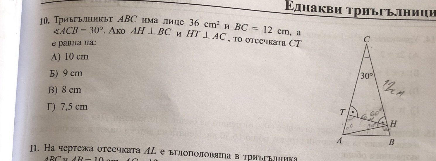 Моля за помощ! Не мога да разбера къде бъркам. Намирам, че АН е 6 см. От там, че лежи срещу ъгъл от 30’ в прав. триъг. АНС следва АС е 12. От там мислех с Питагорова теорема да намеря СН. Но... не е май така.