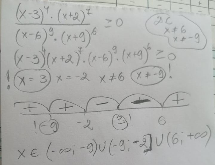 Титинка, защото неравенството е нестрого.. При безкрайностите така или иначе винаги скобата е  за "отворен" интервал, при 6 и 9 в този пример също, защото те не са част от допустимите стойности заради знаменателя, но при -2 скобата трябва да  си е квадратна. За тройката конкретно (въпреки минусите в дублиращия се интервал) - включена е заради опцията =0, в частта с > тройката не отговаря. Затова е или..