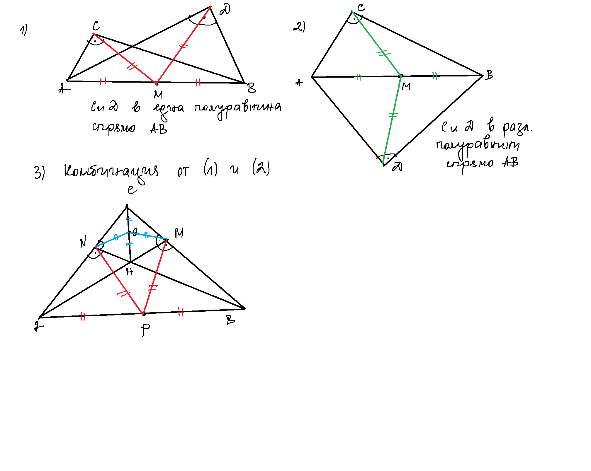 Има ли на един чертеж два правоъгълни триъгълника с ОБЩА хипотенуза, това е подсказка да се избере средата й и да се позлва теоремата за медиана към хипотенузата. Ето примерни варианти: