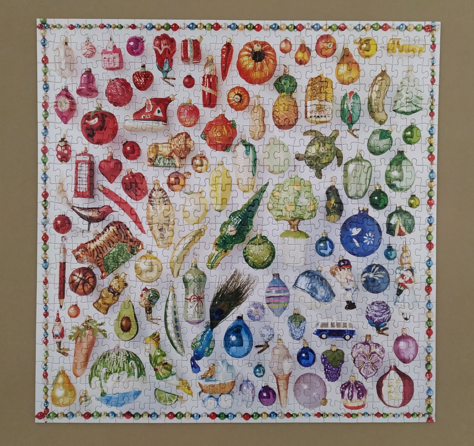 Йоана буквално ми взе репликата Simple Smile И аз показвам пъзел, с който смятах, че ще завърша годината (много тематично подходящ беше), но не успях да го подредя за един ден и го довършихме семейно в първия ден от новата година. Rainbow Ornaments, Galison от 500 парчета: