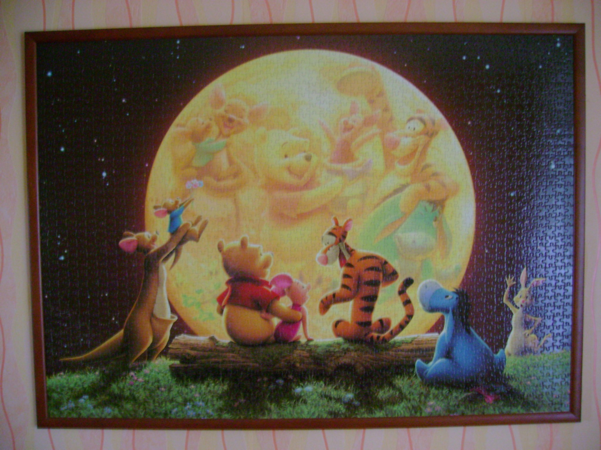 Това ми беше най-трудният пъзел. 2000 части на японската марка Tenyo по всяка вероятност, домъкнат от чужбина. В кулите близнаци Петронас в Куала Лумпур има търговска част - мол. На някой от горните етажи имаше едно малко магазинче само с пъзели - истински рай. Оставаха ми очите във всичко, но най-много си ни влечеше Дисни. И единия път домъкнахме този Мечо Пух - 2000 части. Луната свети в тъмното и беше много красив. Само небето ме измъчи доста. Редих го бременна с първото дете и бързах да го завърша преди да се е родило (правилно предполагах, че след това няма да успея). Едвам се сгъвах и пробвах частите на всяко място до несвяст. Все пак успях. Тогава големите пъзели ги лепях и този стоеше в спалнята ни десетина години докато не се изнесохме.