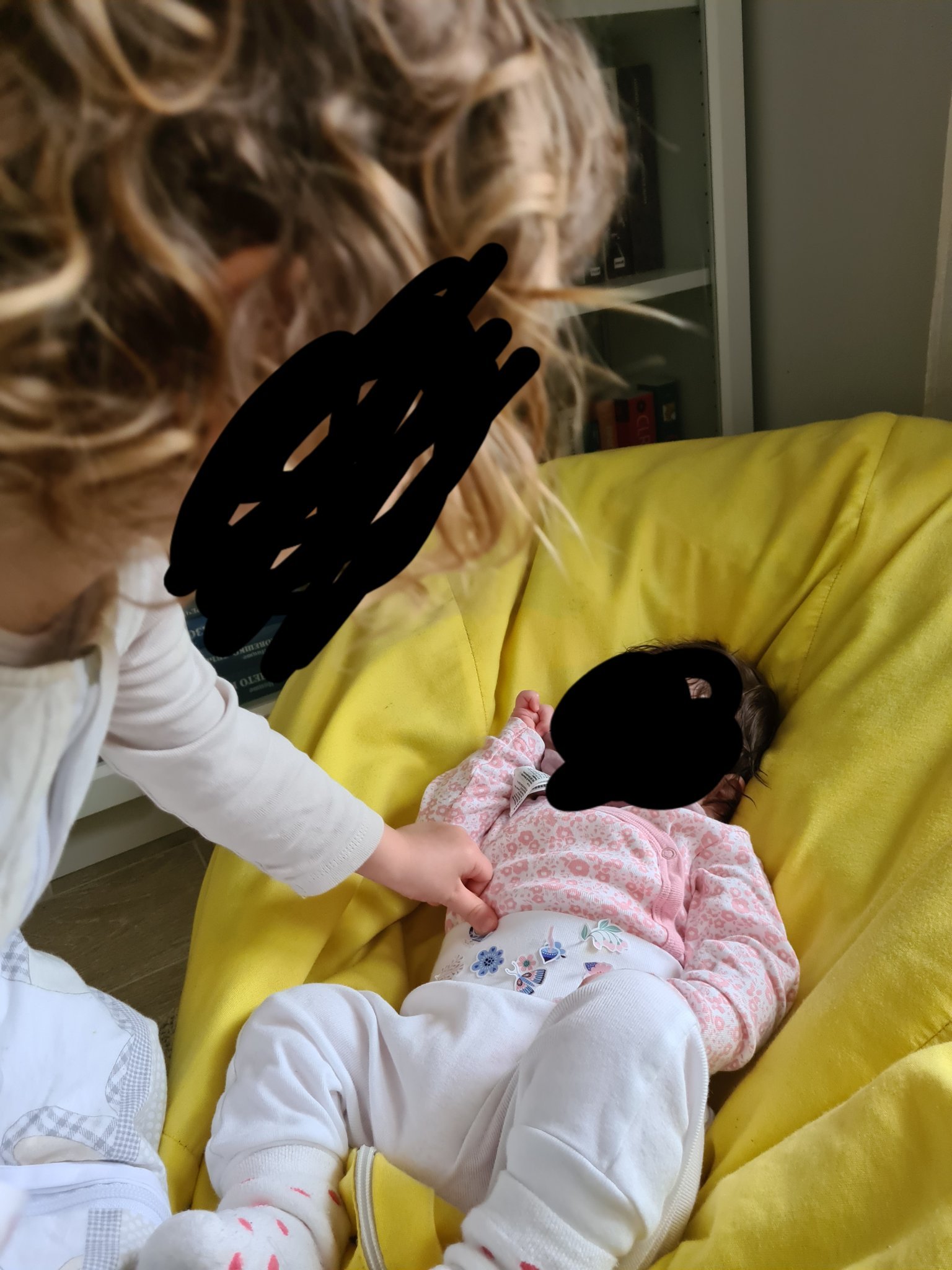 Беба е към 6 кг. Днес става на 4 месеца, док. казва че си върви добре, доста е дългичка, с ромпъри 6-9 сме 🤭 На АМ е