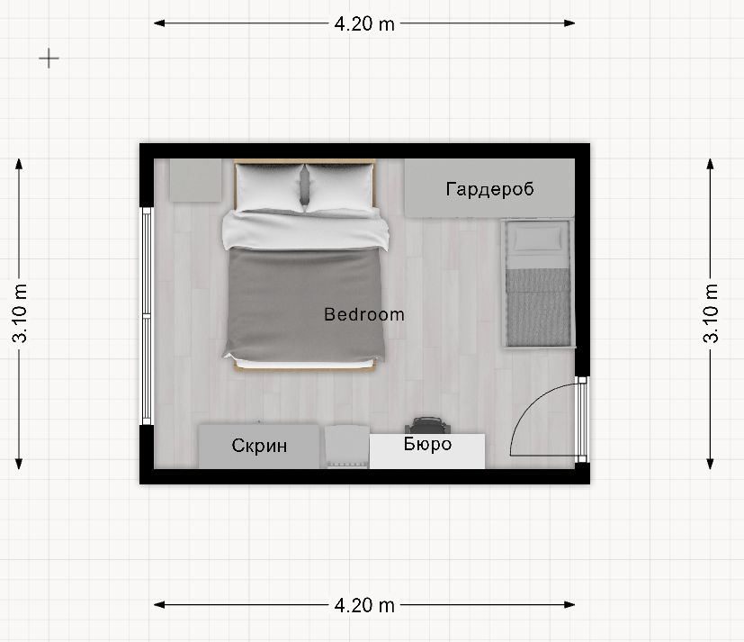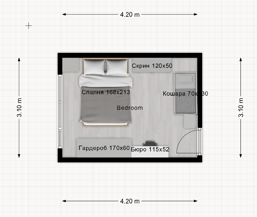 Здравейте, следя ви от време на време, но до сега не съм писала Simple Smile Можете ли да ми дадете мнение по следния казус. Спалнята ни е малка и понеже скоро очакваме бебче, се налага да сместим кошара в нея. Проблемът е, че сме на квартира и не ни се иска да преобзавеждаме, освен това стаята в момента е и офис на ММ тоест има и бюро. Ще приложа като снимка какво сме измислили до момента като разпределение с наличните мебели. Ще се радвам ако имате идеи или поне дадете мнение кой вариант е по-добрия, защото не мога да реша Simple Smile